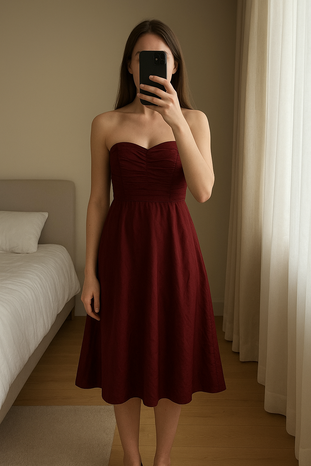 Robe bustier Camaieu debout, face à la caméra, dans une chambre à la lumière douce, avec une lumière naturelle filtrant par la fenêtre.