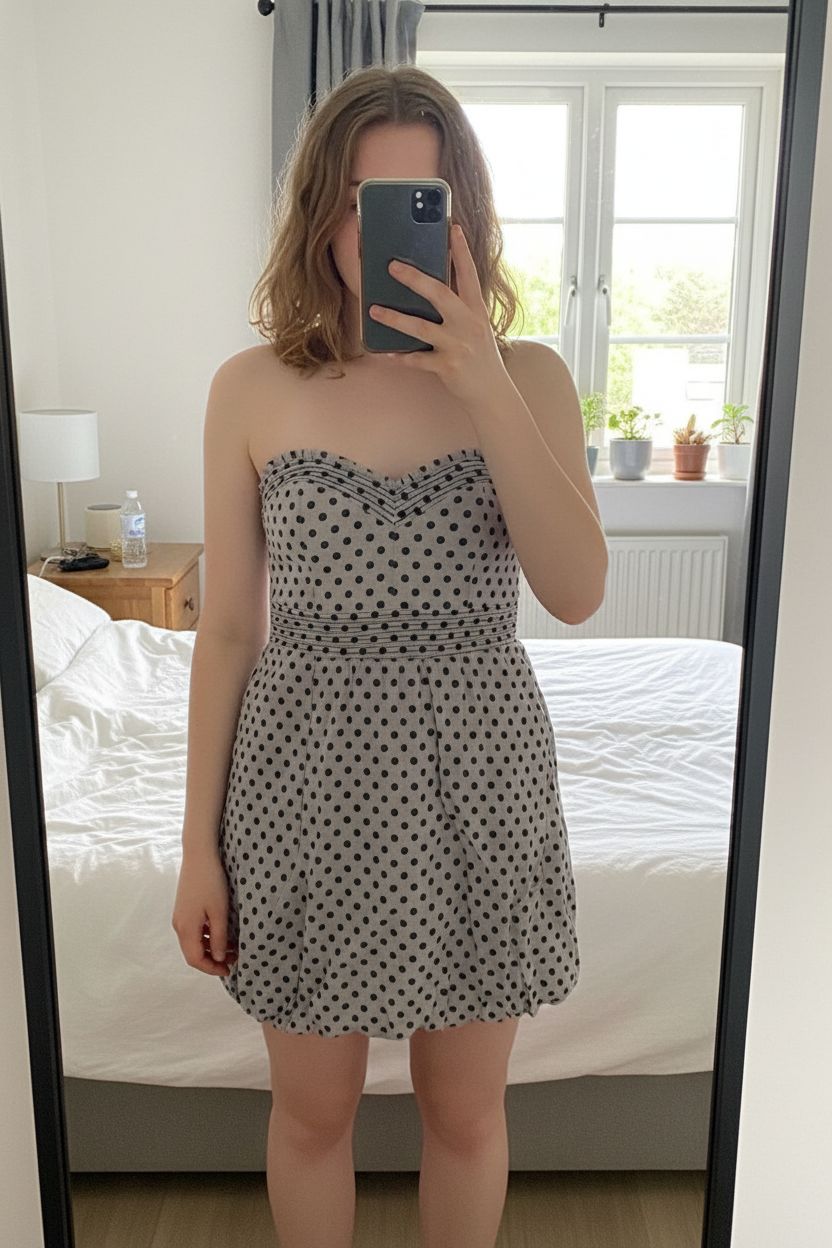 Robe bustier d’été taille L debout, face à la caméra, dans une chambre à la lumière douce, avec une lumière naturelle filtrant par la fenêtre.
