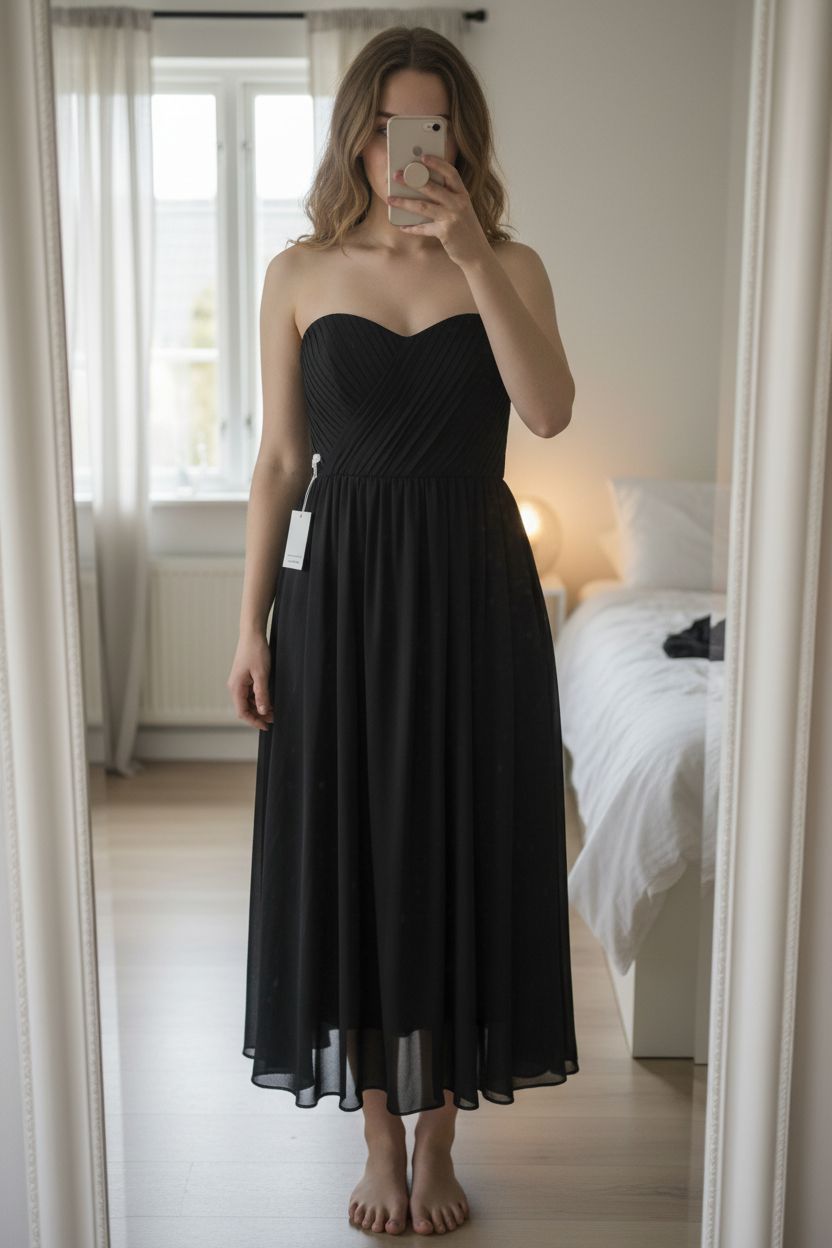 Robe bustier noire & Other Stories - Neuve avec étiquette - T36FR debout, face à la caméra, dans une chambre à la lumière douce, avec une lumière naturelle filtrant par la fenêtre.
