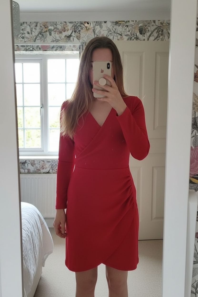 Robe ceintrée debout, face à la caméra, dans une chambre à la lumière douce, avec une lumière naturelle filtrant par la fenêtre.