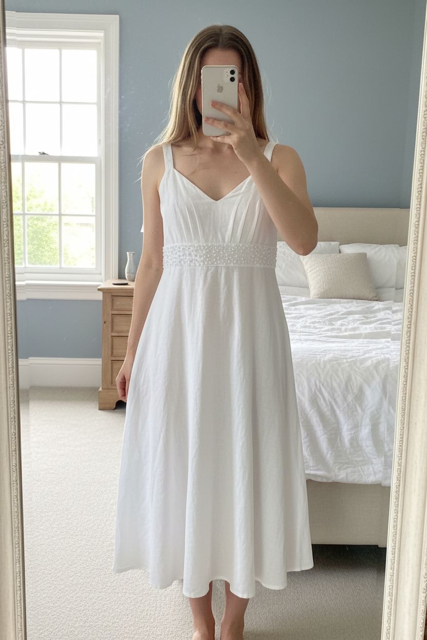 Robe ceintrée en lin T38 Etam debout, face à la caméra, dans une chambre à la lumière douce, avec une lumière naturelle filtrant par la fenêtre.