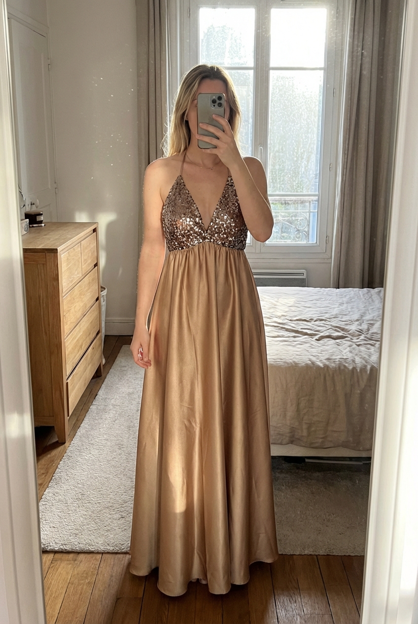 Robe champagne debout, face à la caméra, dans une chambre à la lumière douce, avec une lumière naturelle filtrant par la fenêtre.