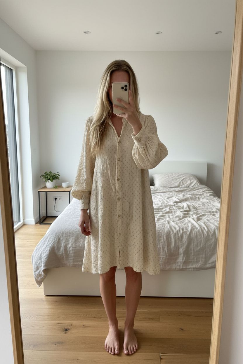 Robe chemise debout, face à la caméra, dans une chambre à la lumière douce, avec une lumière naturelle filtrant par la fenêtre.