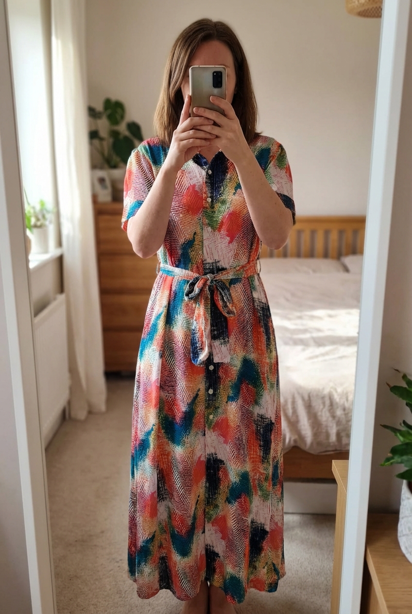Robe chemise longue multicolore taille 38 neuve debout, face à la caméra, dans une chambre à la lumière douce, avec une lumière naturelle filtrant par la fenêtre.