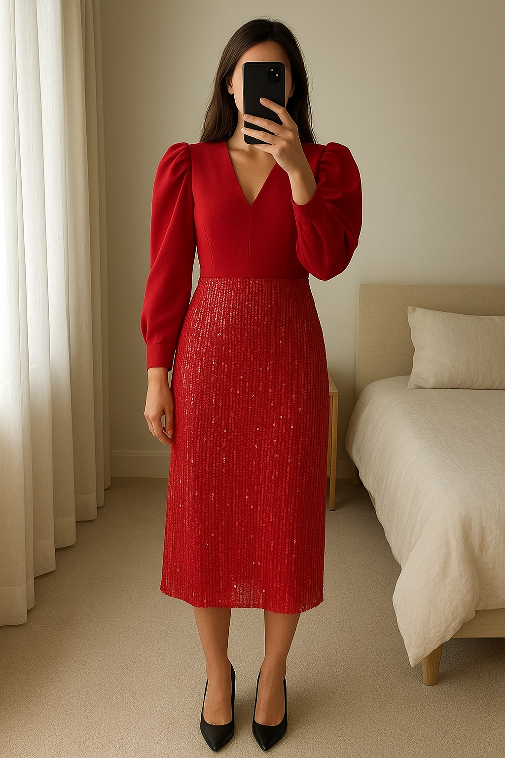 Robe chic rouge sequins Taille 36 debout, face à la caméra, dans une chambre à la lumière douce, avec une lumière naturelle filtrant par la fenêtre.