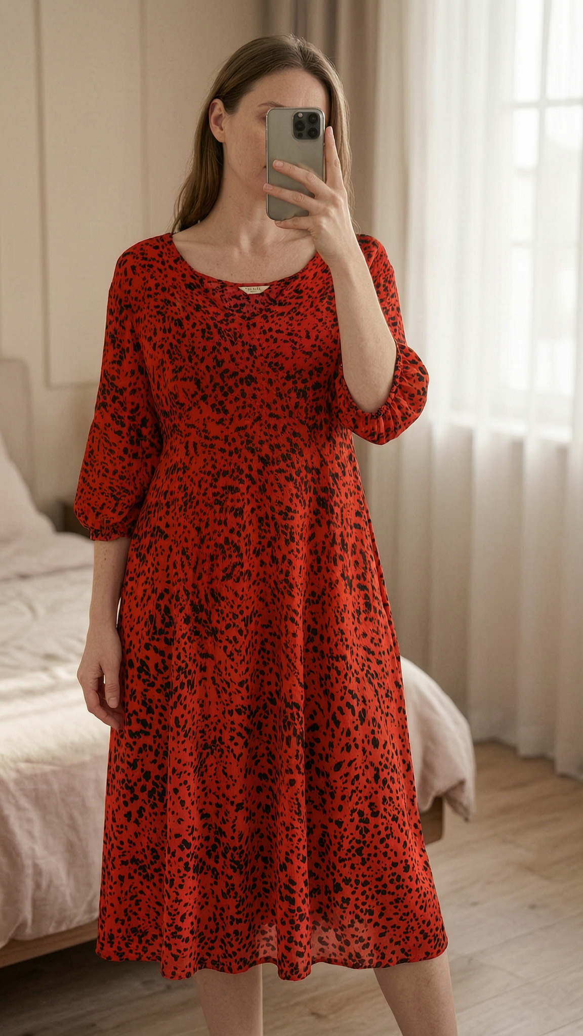 Robe Christy T5 debout, face à la caméra, dans une chambre à la lumière douce, avec une lumière naturelle filtrant par la fenêtre.