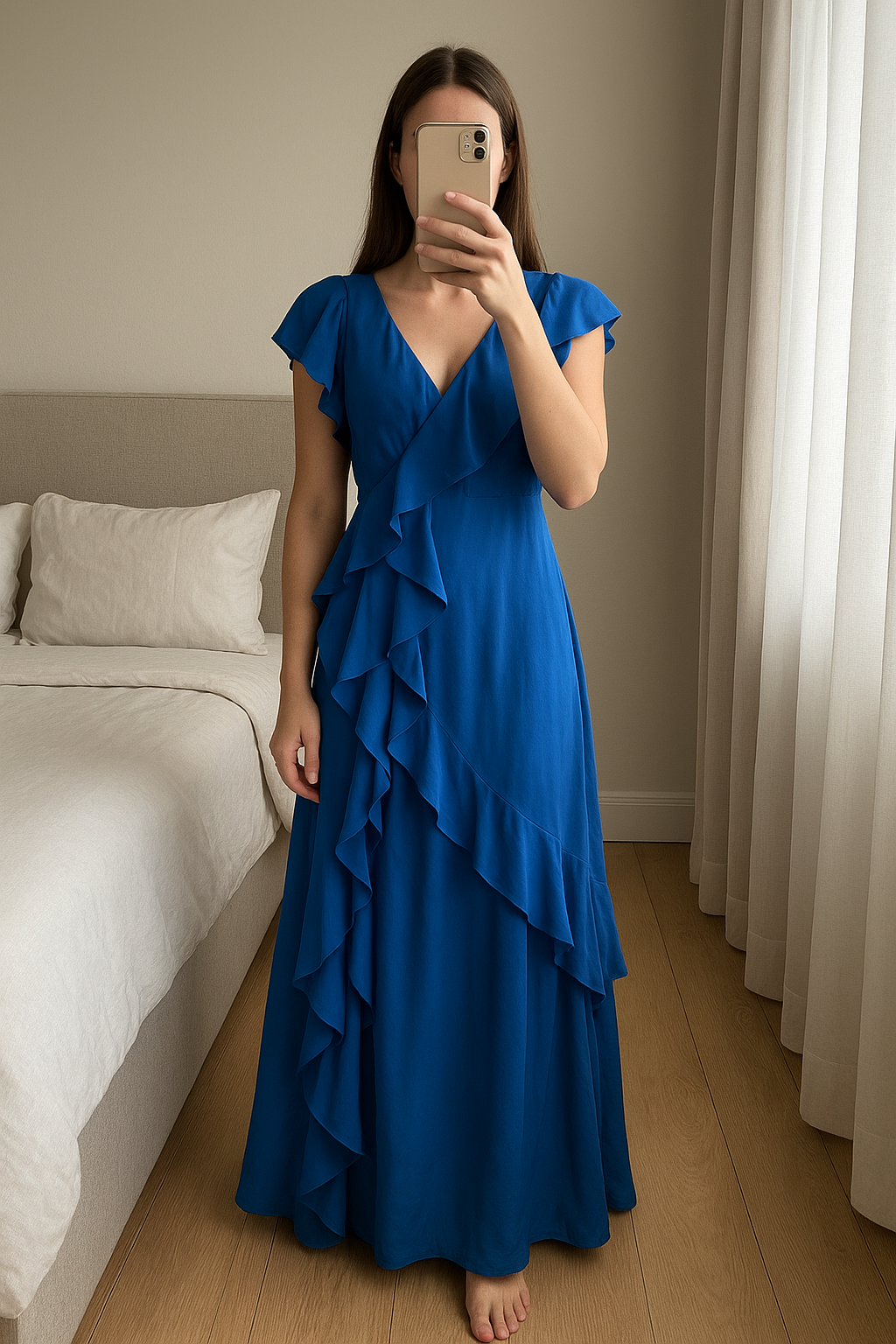 Robe cocktail maje debout, face à la caméra, dans une chambre à la lumière douce, avec une lumière naturelle filtrant par la fenêtre.