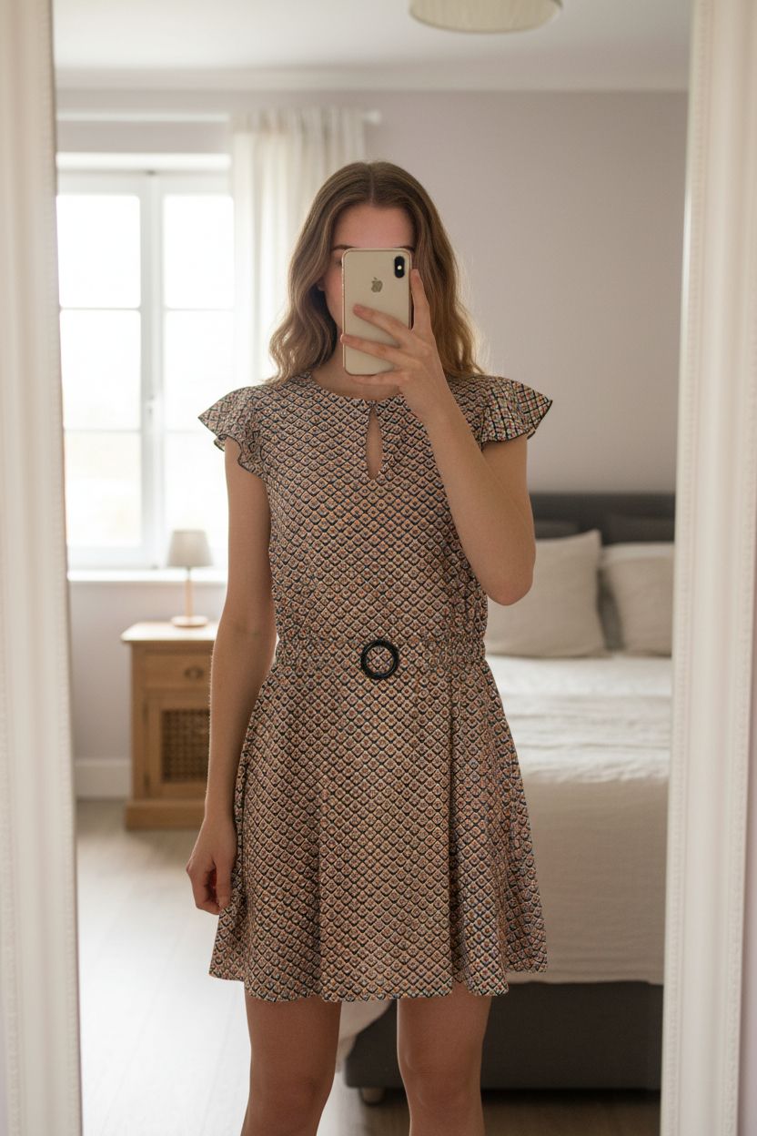 Robe courte debout, face à la caméra, dans une chambre à la lumière douce, avec une lumière naturelle filtrant par la fenêtre.
