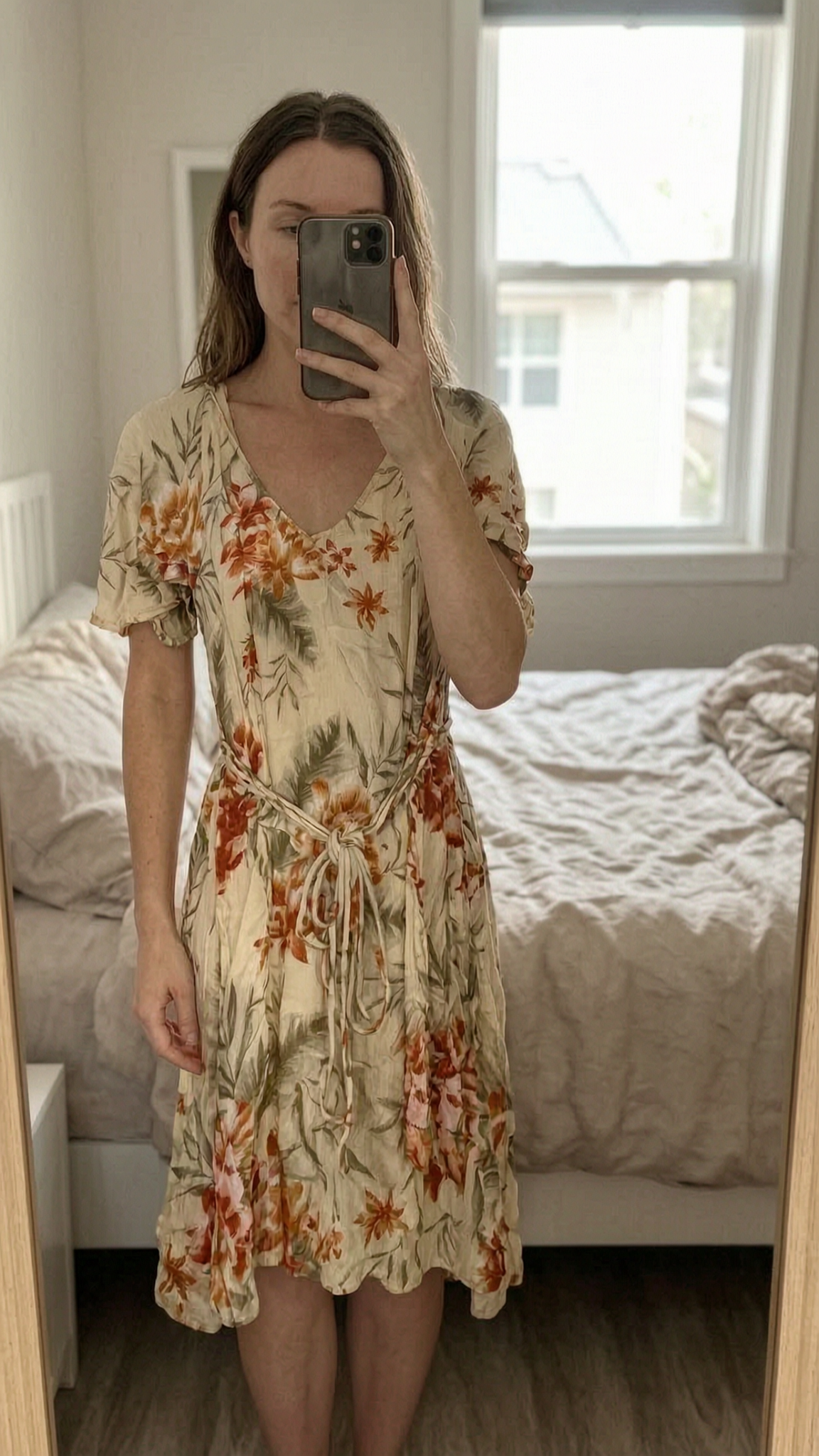 Robe courte debout, face à la caméra, dans une chambre à la lumière douce, avec une lumière naturelle filtrant par la fenêtre.