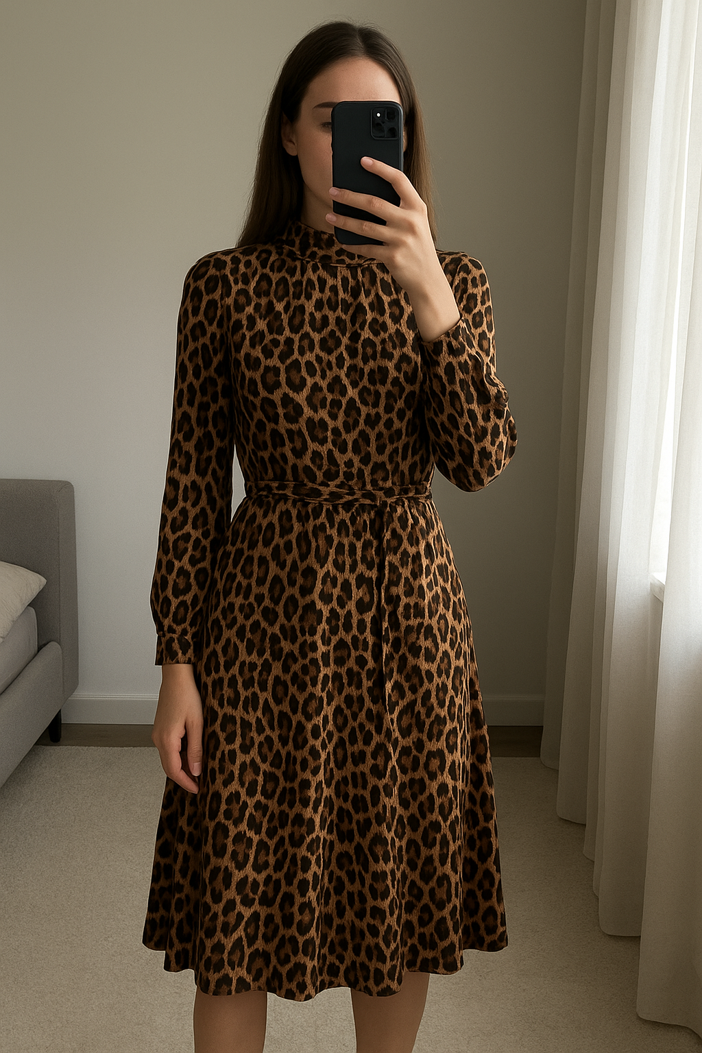 robe d’été debout, face à la caméra, dans une chambre à la lumière douce, avec une lumière naturelle filtrant par la fenêtre.
