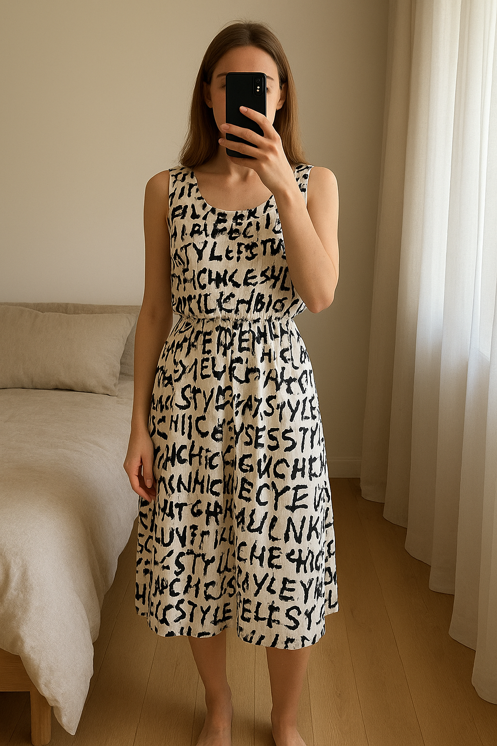 Robe d'été sans manches motifs manuscrits debout, face à la caméra, dans une chambre à la lumière douce, avec une lumière naturelle filtrant par la fenêtre.