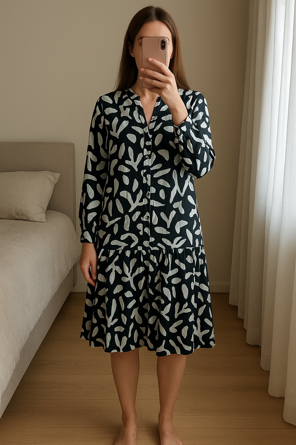 Robe de chez C&A debout, face à la caméra, dans une chambre à la lumière douce, avec une lumière naturelle filtrant par la fenêtre.