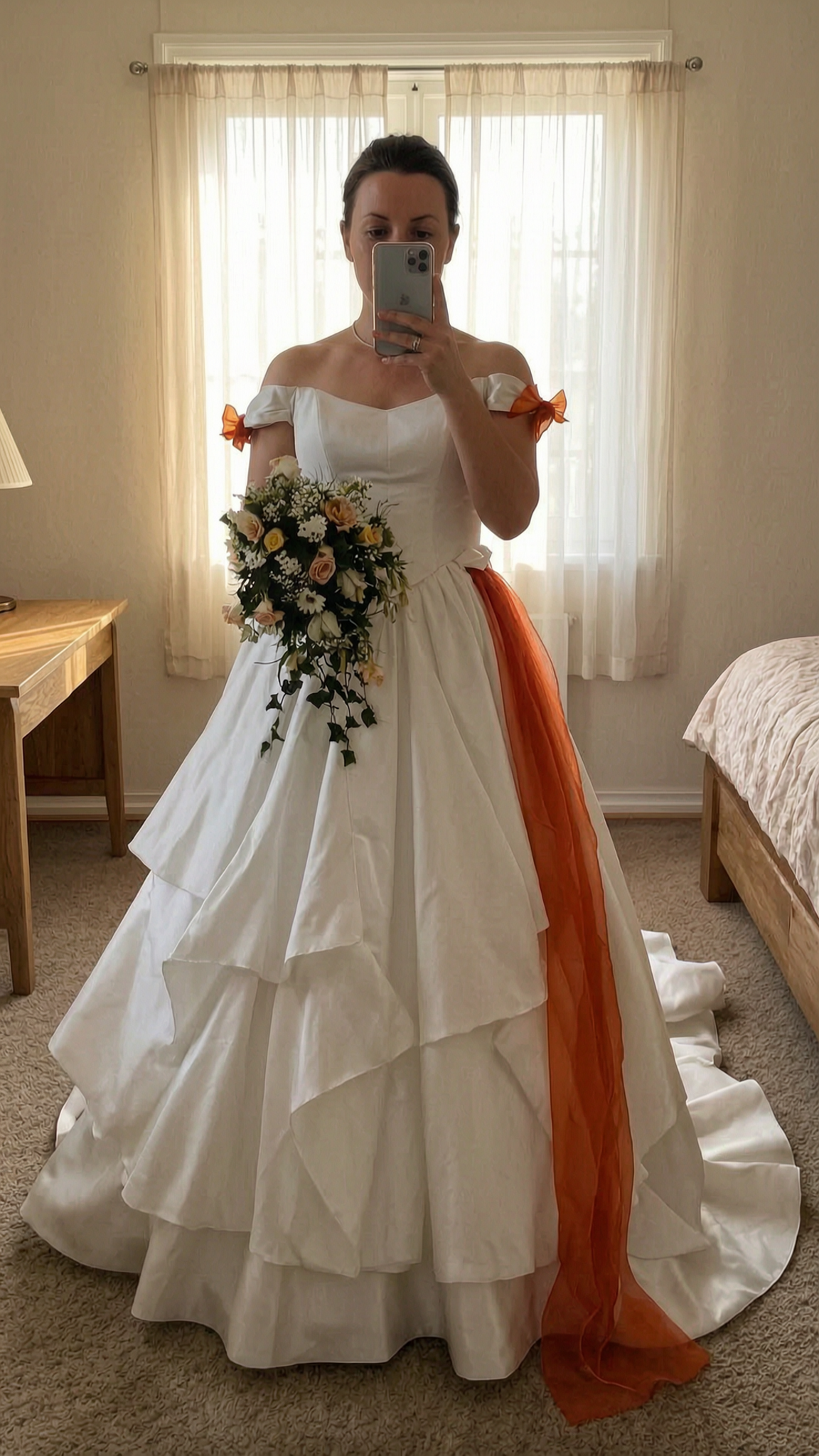 Robe de mariée debout, face à la caméra, dans une chambre à la lumière douce, avec une lumière naturelle filtrant par la fenêtre.