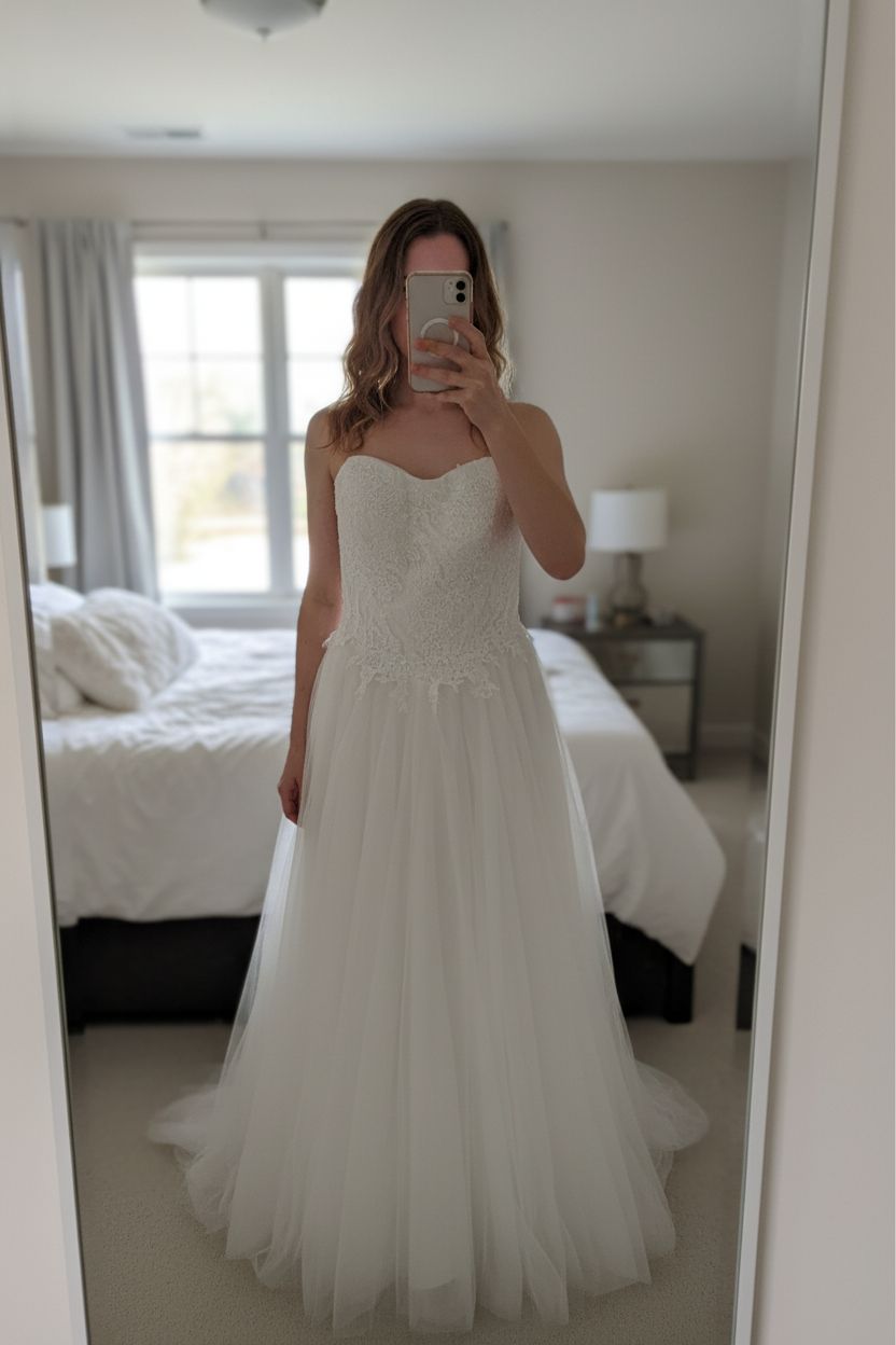 Robe de mariée blanche Taille M debout, face à la caméra, dans une chambre à la lumière douce, avec une lumière naturelle filtrant par la fenêtre.