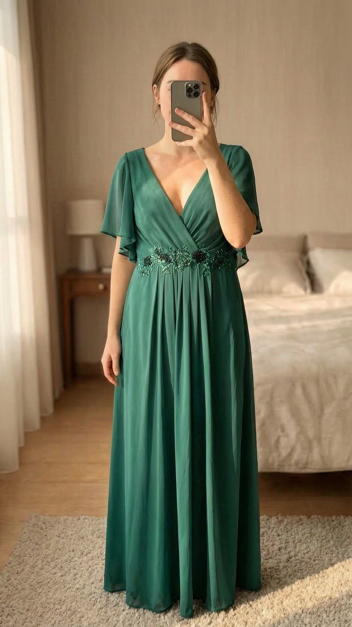 Robe de soirée longue Ever Pretty debout, face à la caméra, dans une chambre à la lumière douce, avec une lumière naturelle filtrant par la fenêtre.