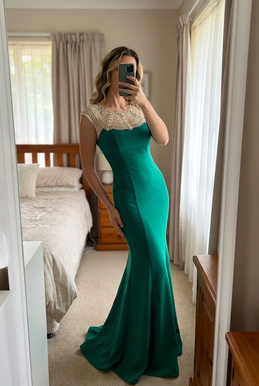 Une personne en 💚 Robe de soirée longue verte brodée cambrant légèrement le dos pour une pose dynamique, avec une silhouette légèrement plus ronde, dans une chambre à la lumière douce, avec une lumière naturelle filtrant par la fenêtre.