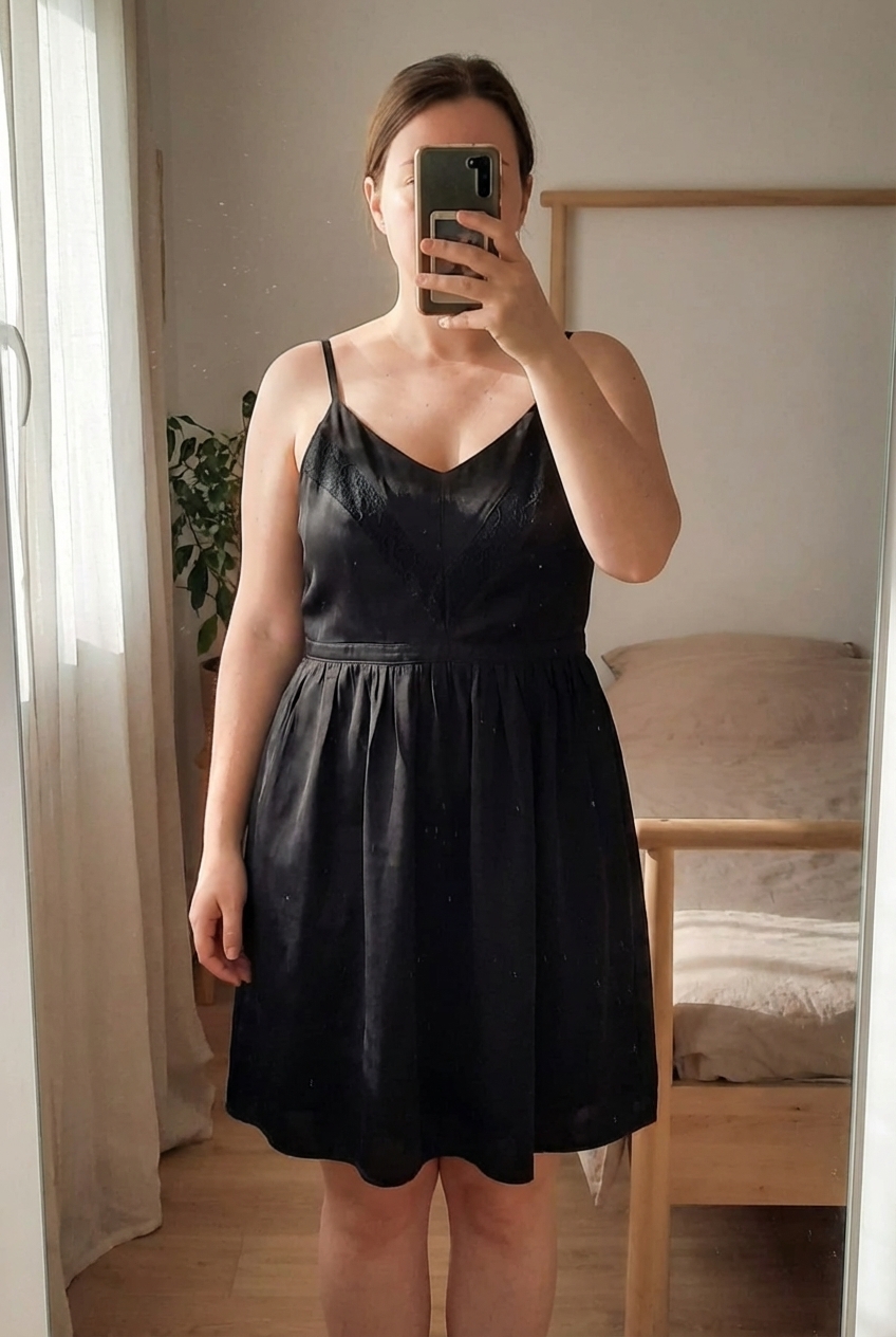 Une personne en Robe de soirée noire NAF NAF debout, face à la caméra, avec une silhouette légèrement plus ronde, dans une chambre à la lumière douce, avec une lumière naturelle filtrant par la fenêtre.