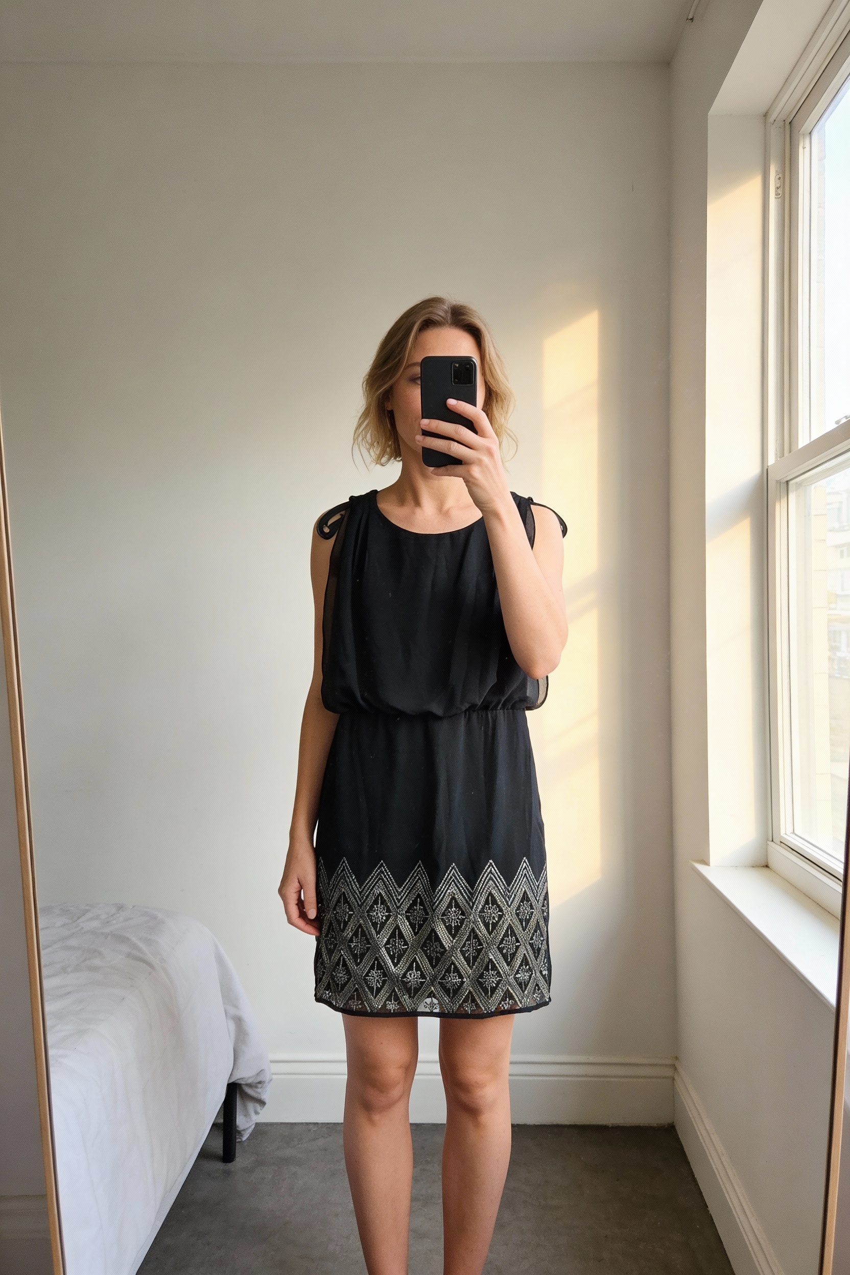 Robe de soirée noire à sequins Vero Moda T36 debout, face à la caméra, dans une chambre à la lumière douce, avec une lumière naturelle filtrant par la fenêtre.