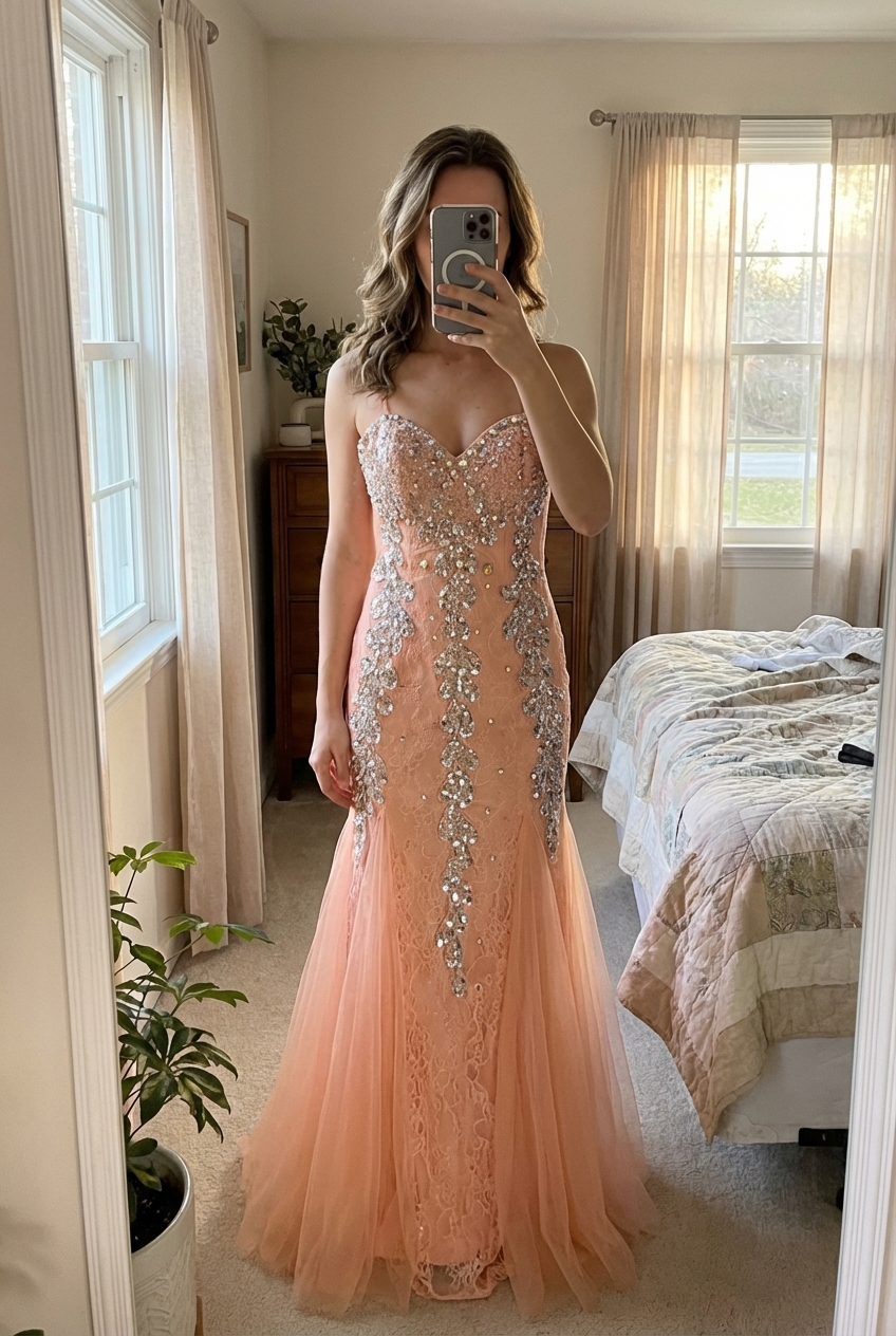 Robe de soirée robe de cocktail robe en tulle avec des stass Taille S debout, face à la caméra, dans une chambre à la lumière douce, avec une lumière naturelle filtrant par la fenêtre.