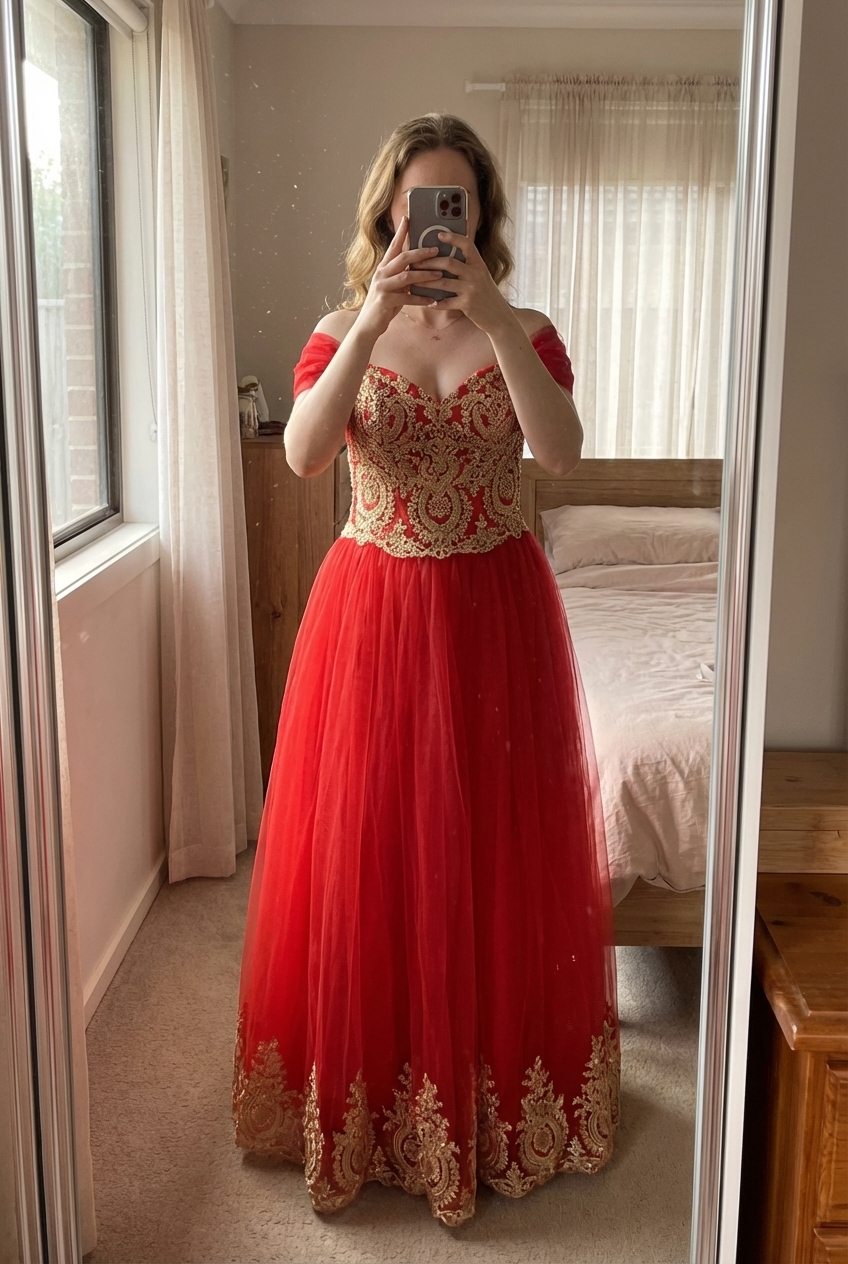 Robe de soirée rouge taille L debout, face à la caméra, dans une chambre à la lumière douce, avec une lumière naturelle filtrant par la fenêtre.