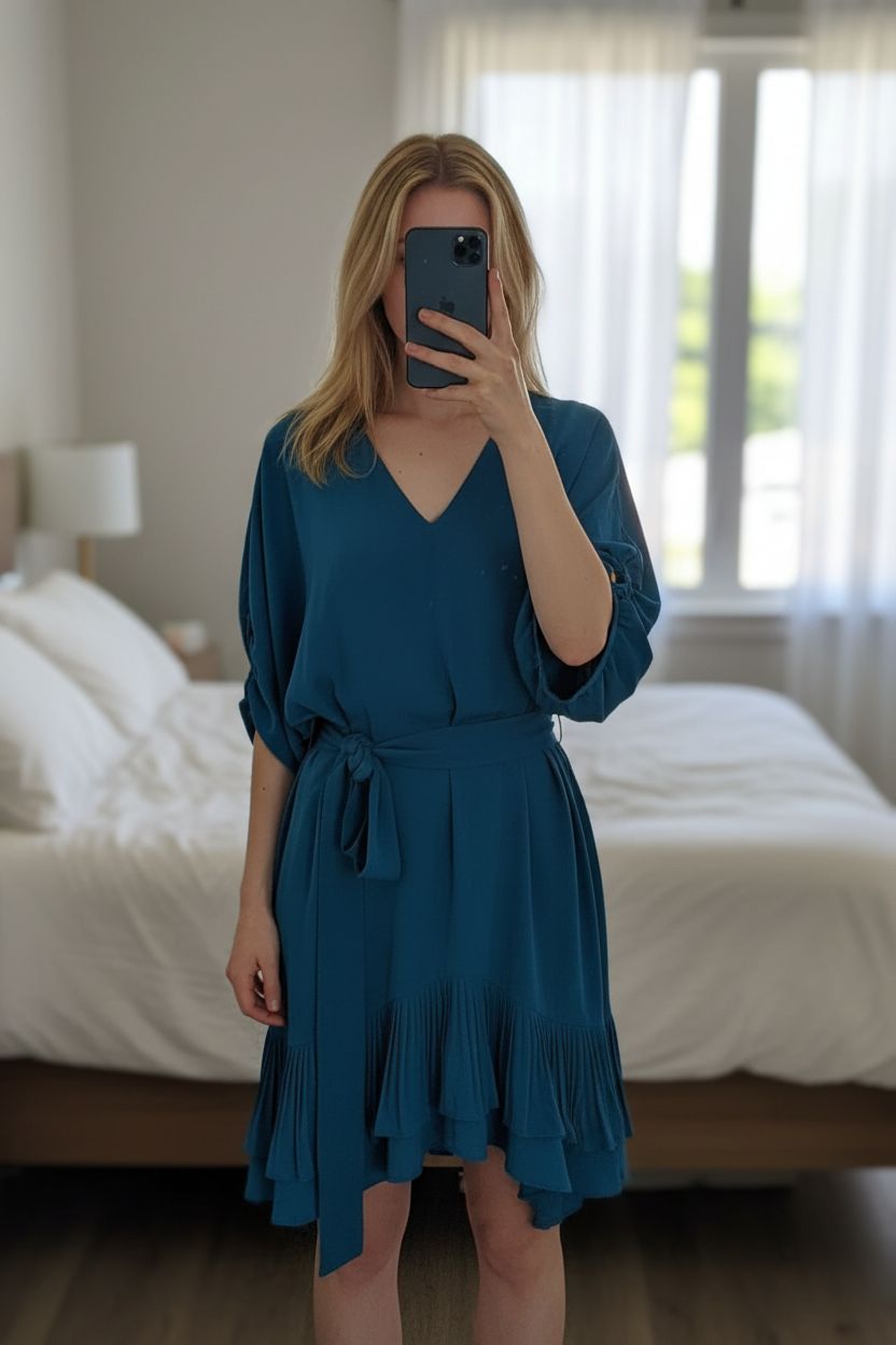 Robe Diane von Fürstenberg robe blousante mi-longue T38 / décolleté flatteur – très peu portée debout, face à la caméra, dans une chambre à la lumière douce, avec une lumière naturelle filtrant par la fenêtre.