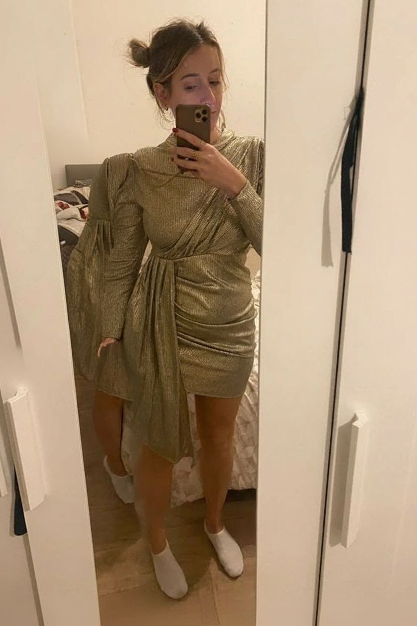 Robe doré gold avec traine debout, face à la caméra, dans une chambre à la lumière douce, avec une lumière naturelle filtrant par la fenêtre.