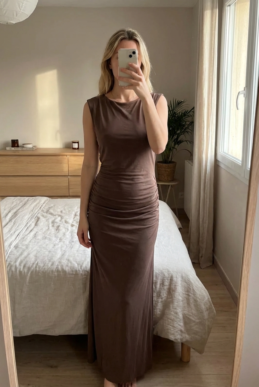 En un clic, notre IA transforme votre visuel produit en photo portée réaliste.