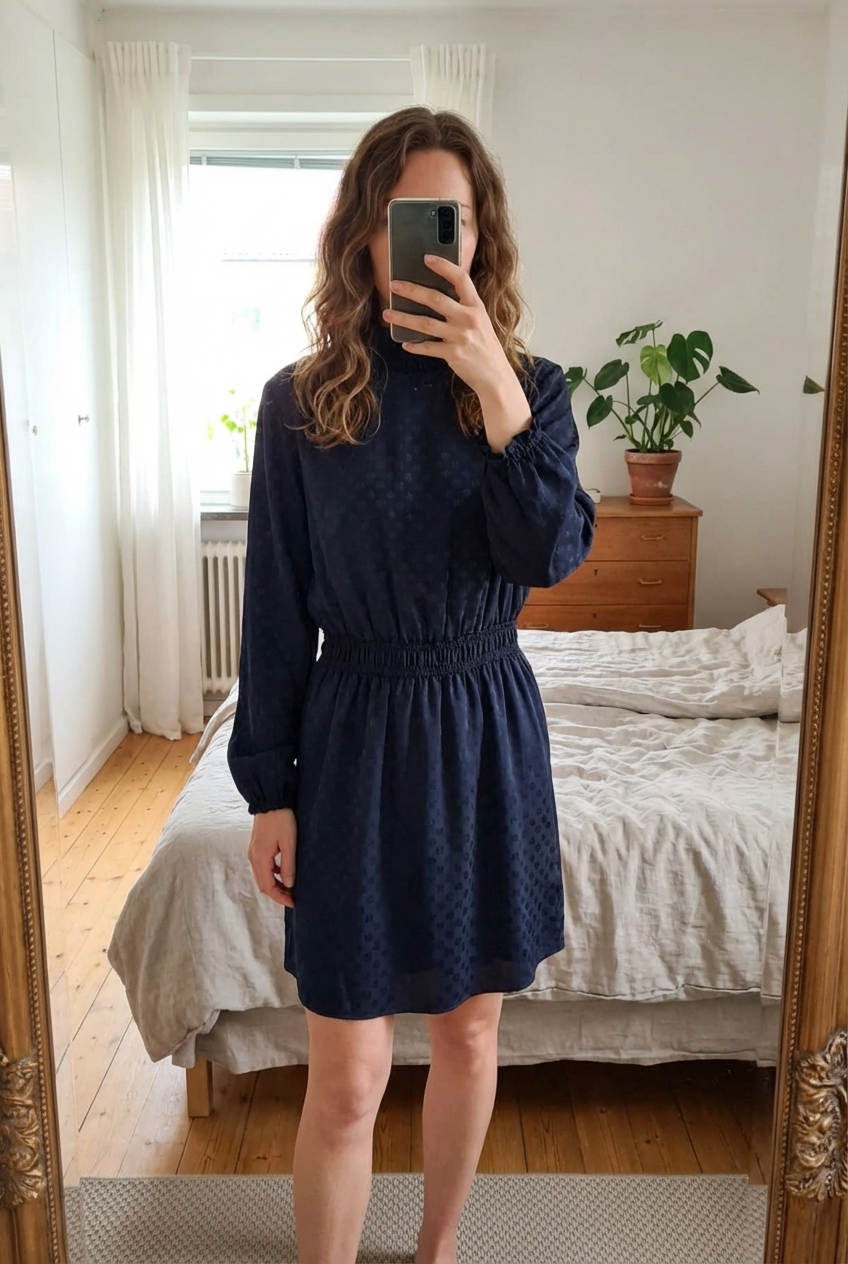 Robe droite bleue marine debout, face à la caméra, dans une chambre à la lumière douce, avec une lumière naturelle filtrant par la fenêtre.