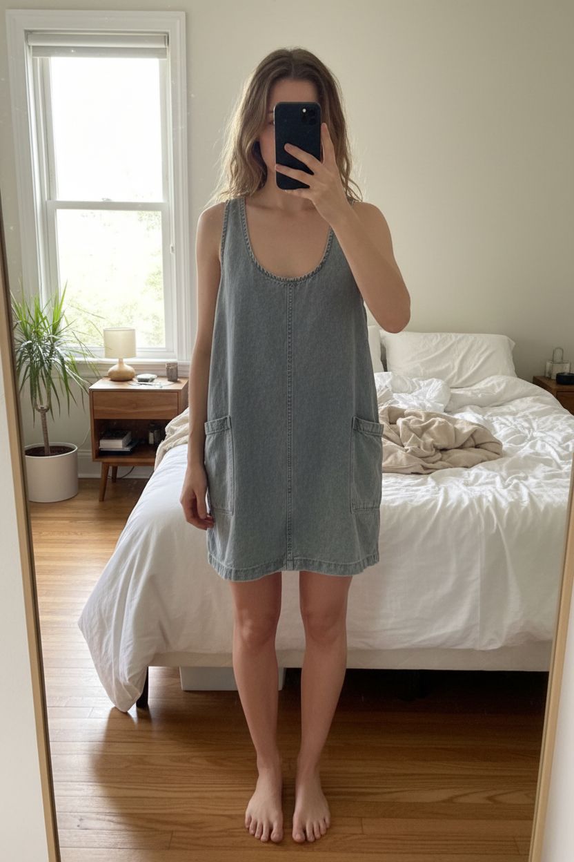 Robe en jean Promod debout, face à la caméra, dans une chambre à la lumière douce, avec une lumière naturelle filtrant par la fenêtre.