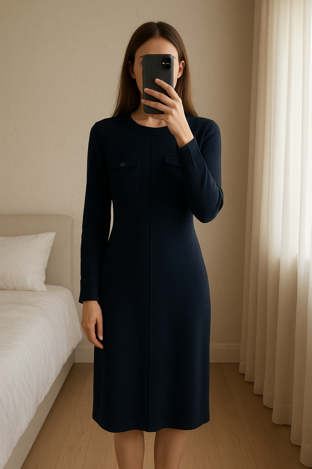 Robe en laine de pie, mirando a la cámara, en un dormitorio con luz suave y natural filtrándose por la ventana.