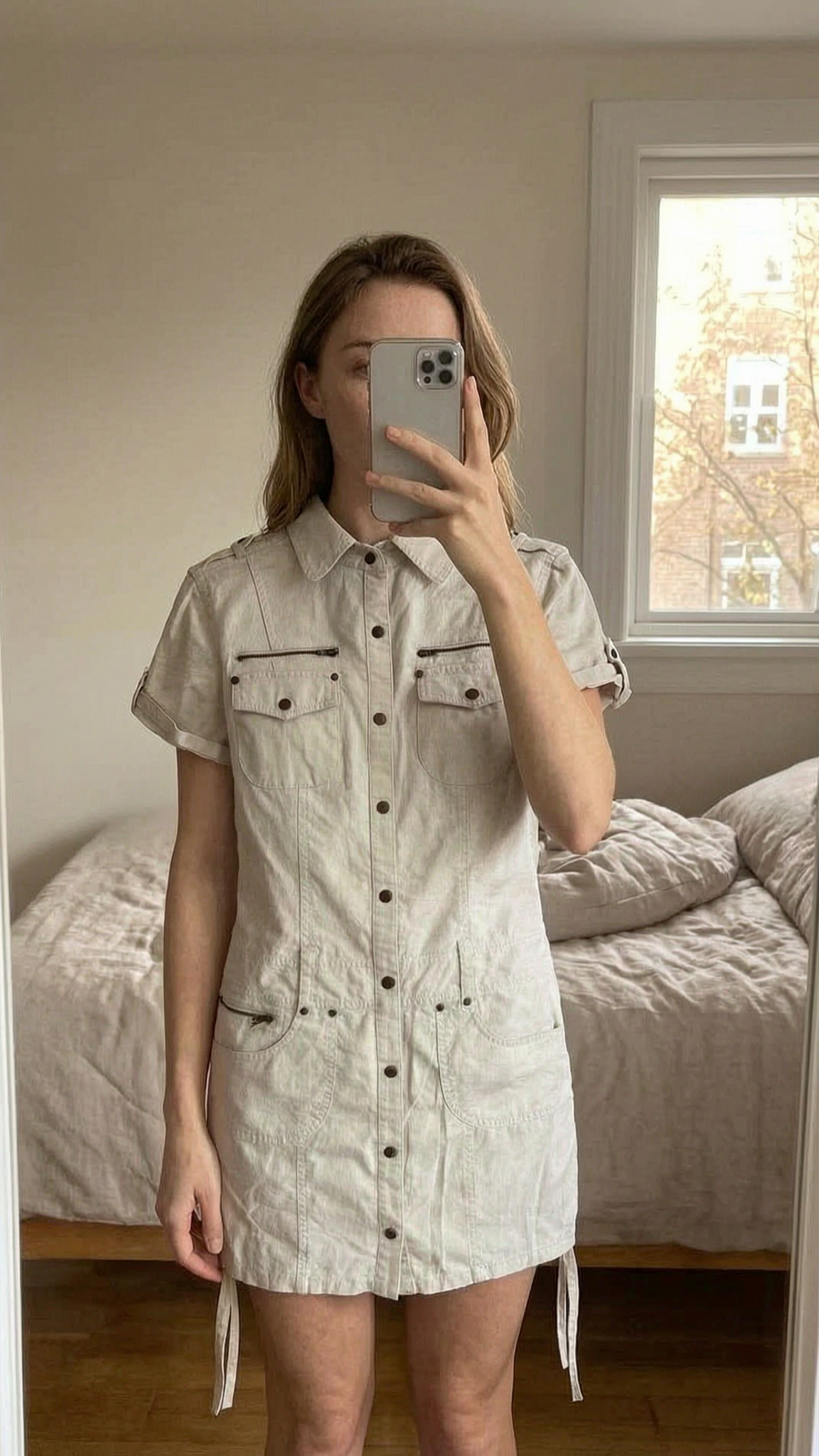 Robe en lin Camaïeu (neuve) debout, face à la caméra, dans une chambre à la lumière douce, avec une lumière naturelle filtrant par la fenêtre.