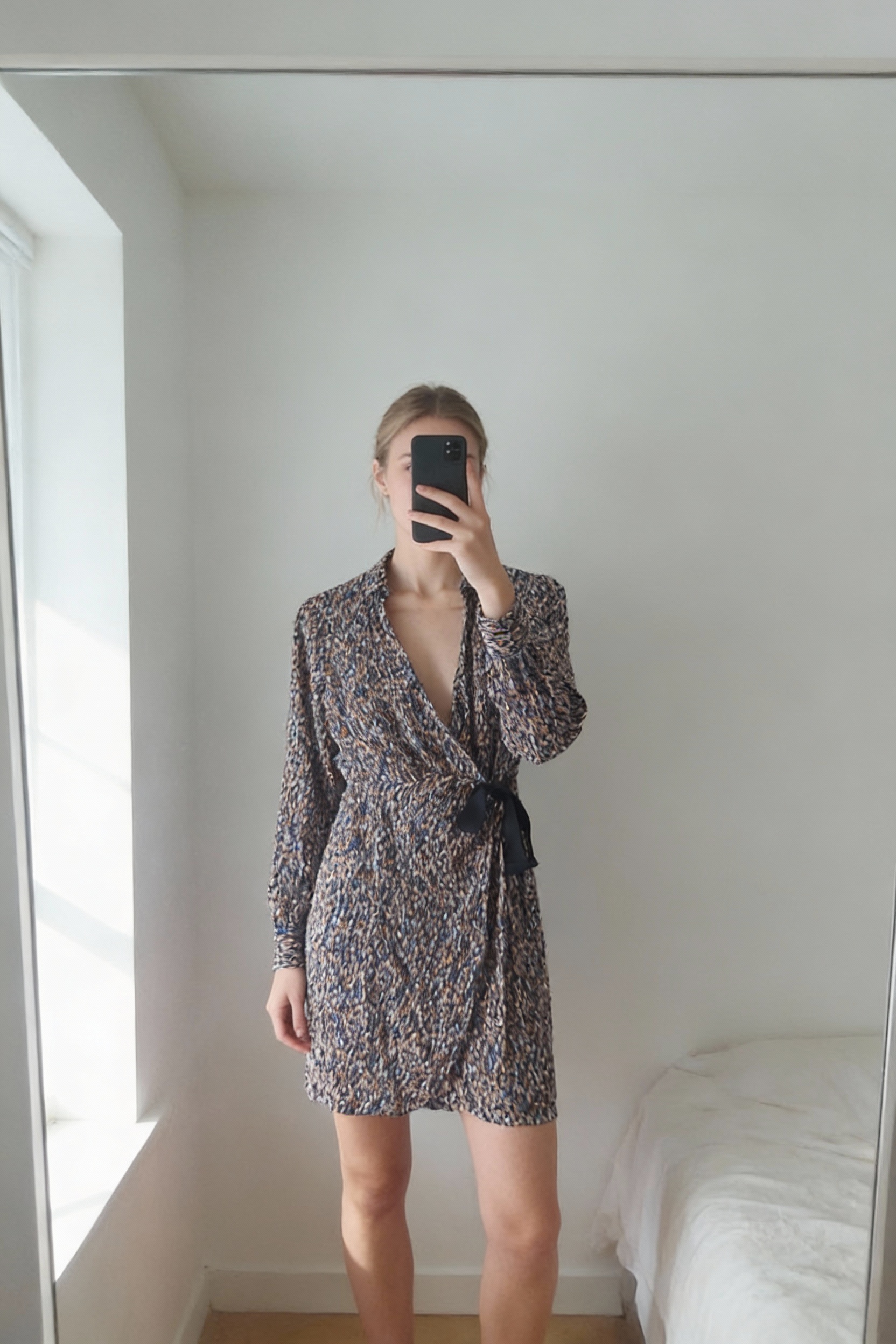 Robe Etam neuve S debout, face à la caméra, dans une chambre à la lumière douce, avec une lumière naturelle filtrant par la fenêtre.