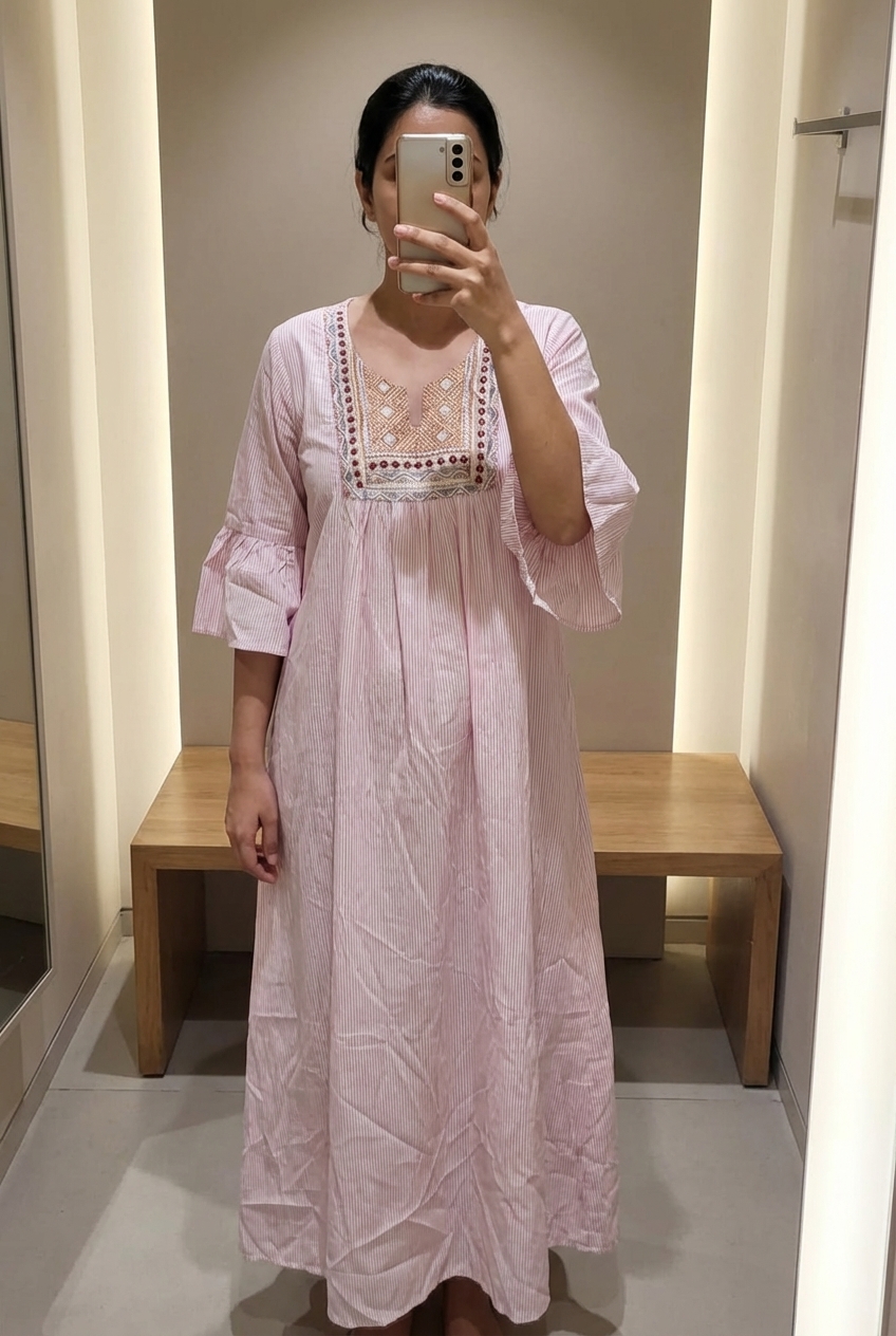 Une personne en Robe femme debout, face à la caméra, dans une cabine d’essayage de style boutique avec un miroir et une décoration neutre.