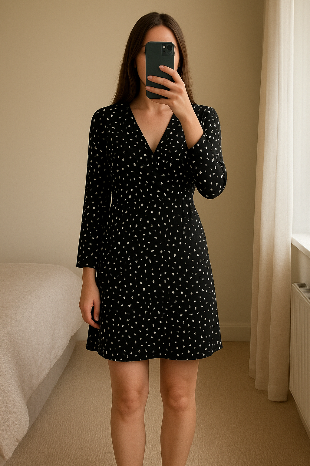 Robe Femme d hiver a petit poid debout, face à la caméra, dans une chambre à la lumière douce, avec une lumière naturelle filtrant par la fenêtre.