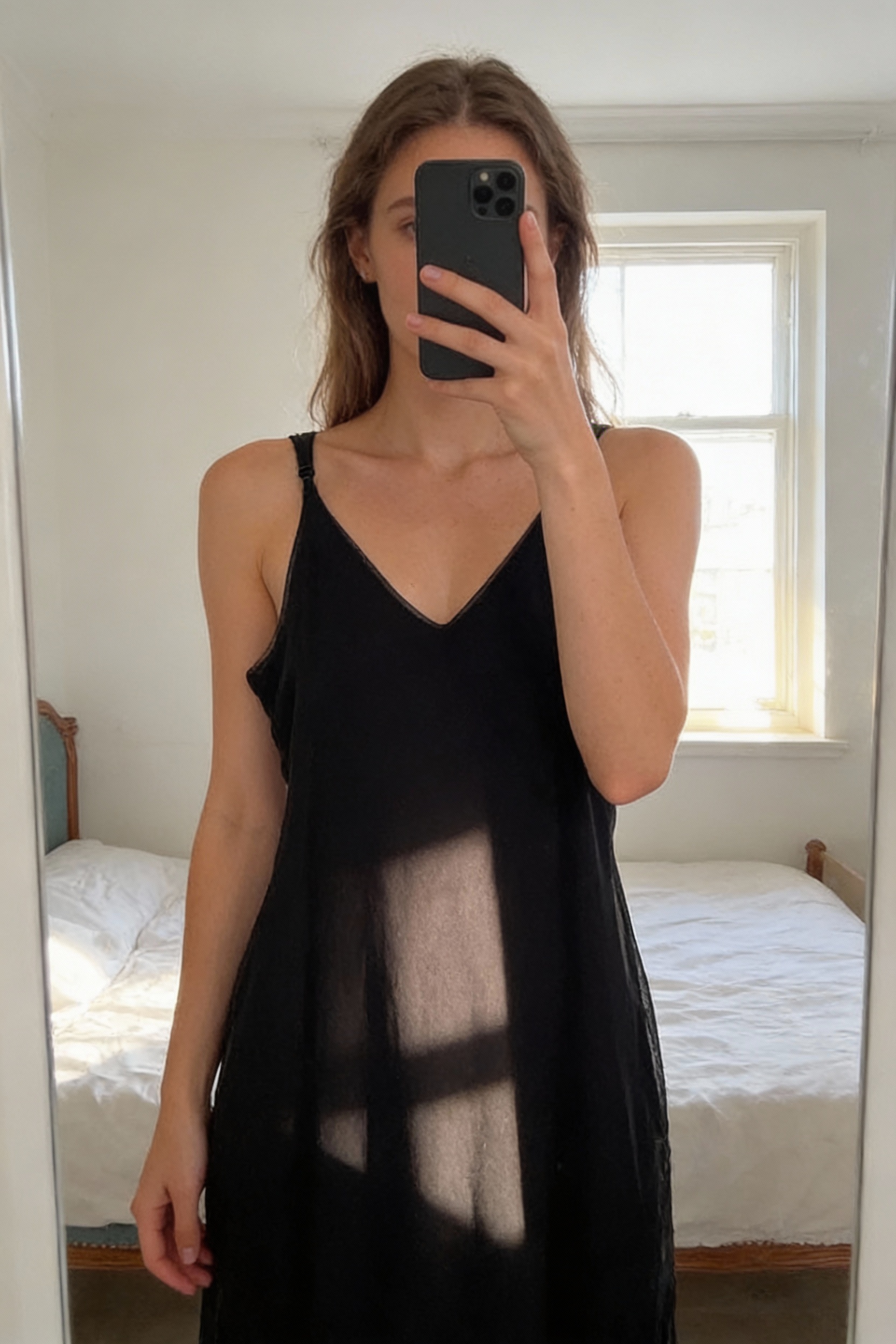 Robe Femme noir 38/40 debout, face à la caméra, dans une chambre à la lumière douce, avec une lumière naturelle filtrant par la fenêtre.