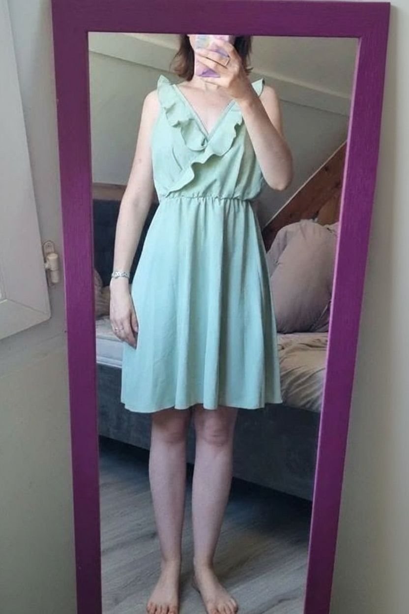 Robe femme vert d'eau taille 36 shein debout, face à la caméra, dans une chambre à la lumière douce, avec une lumière naturelle filtrant par la fenêtre.