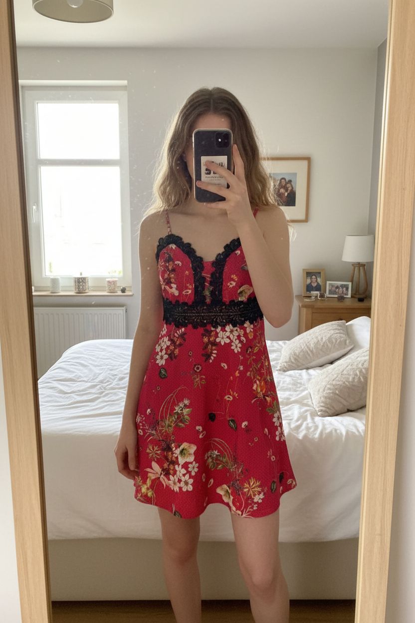 Robe fleurie debout, face à la caméra, dans une chambre à la lumière douce, avec une lumière naturelle filtrant par la fenêtre.