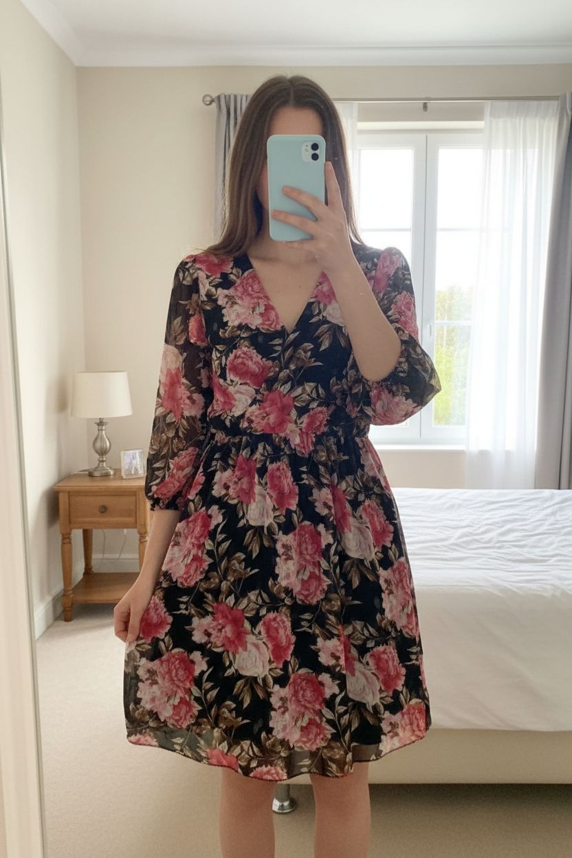 Robe à fleurs noir et rose taille M debout, face à la caméra, dans une chambre à la lumière douce, avec une lumière naturelle filtrant par la fenêtre.