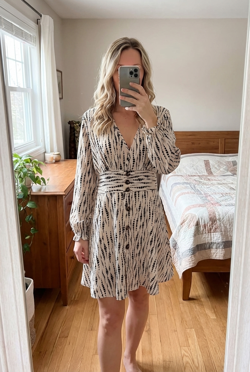 Robe fluide beige et noir confortable taille 42 debout, face à la caméra, dans une chambre à la lumière douce, avec une lumière naturelle filtrant par la fenêtre.