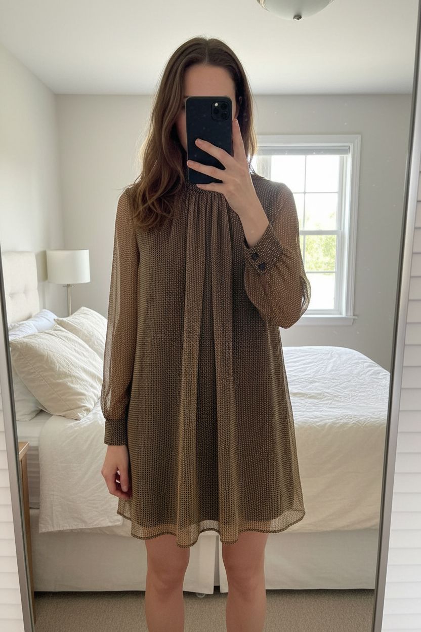Une personne en Robe fluide petits carreaux Claudie Pierlot T36 neuf debout, face à la caméra, avec une silhouette fine, dans une chambre à la lumière douce, avec une lumière naturelle filtrant par la fenêtre.