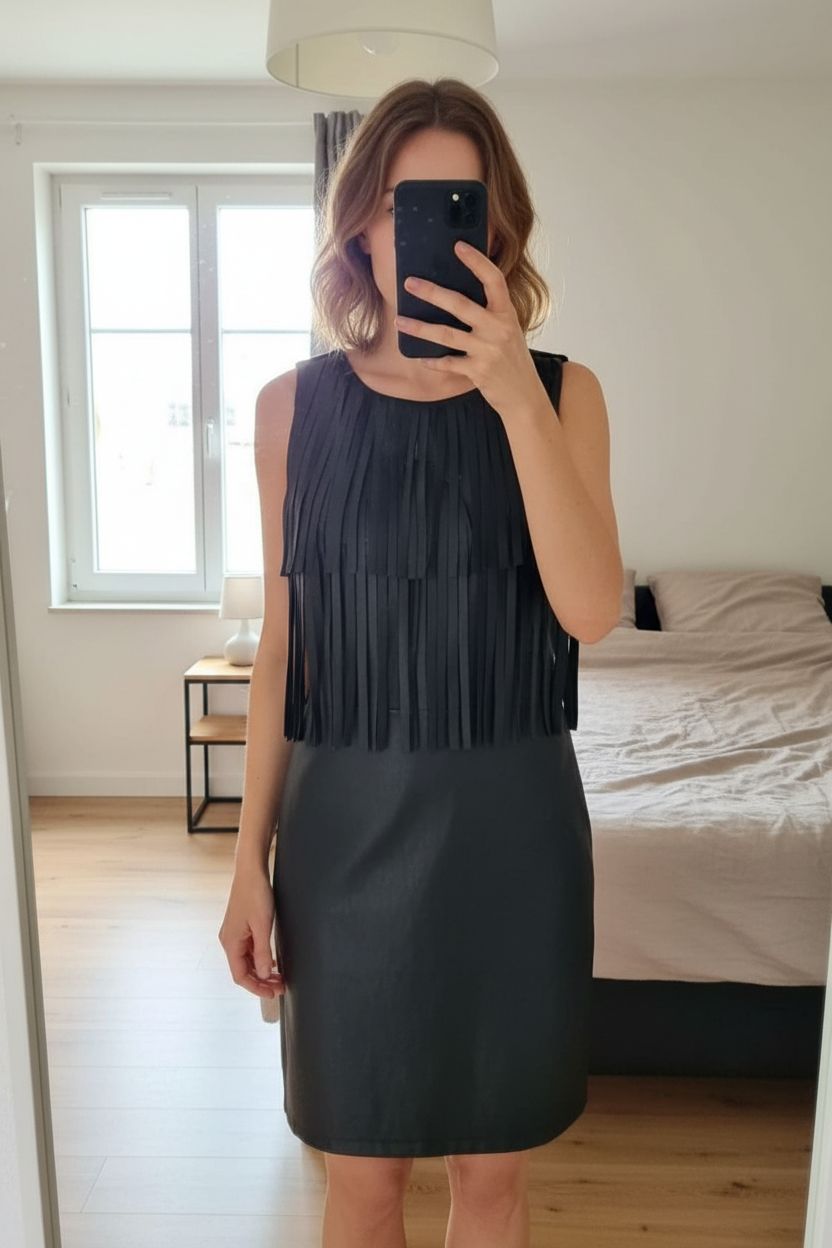 Robe à franges debout, face à la caméra, dans une chambre à la lumière douce, avec une lumière naturelle filtrant par la fenêtre.