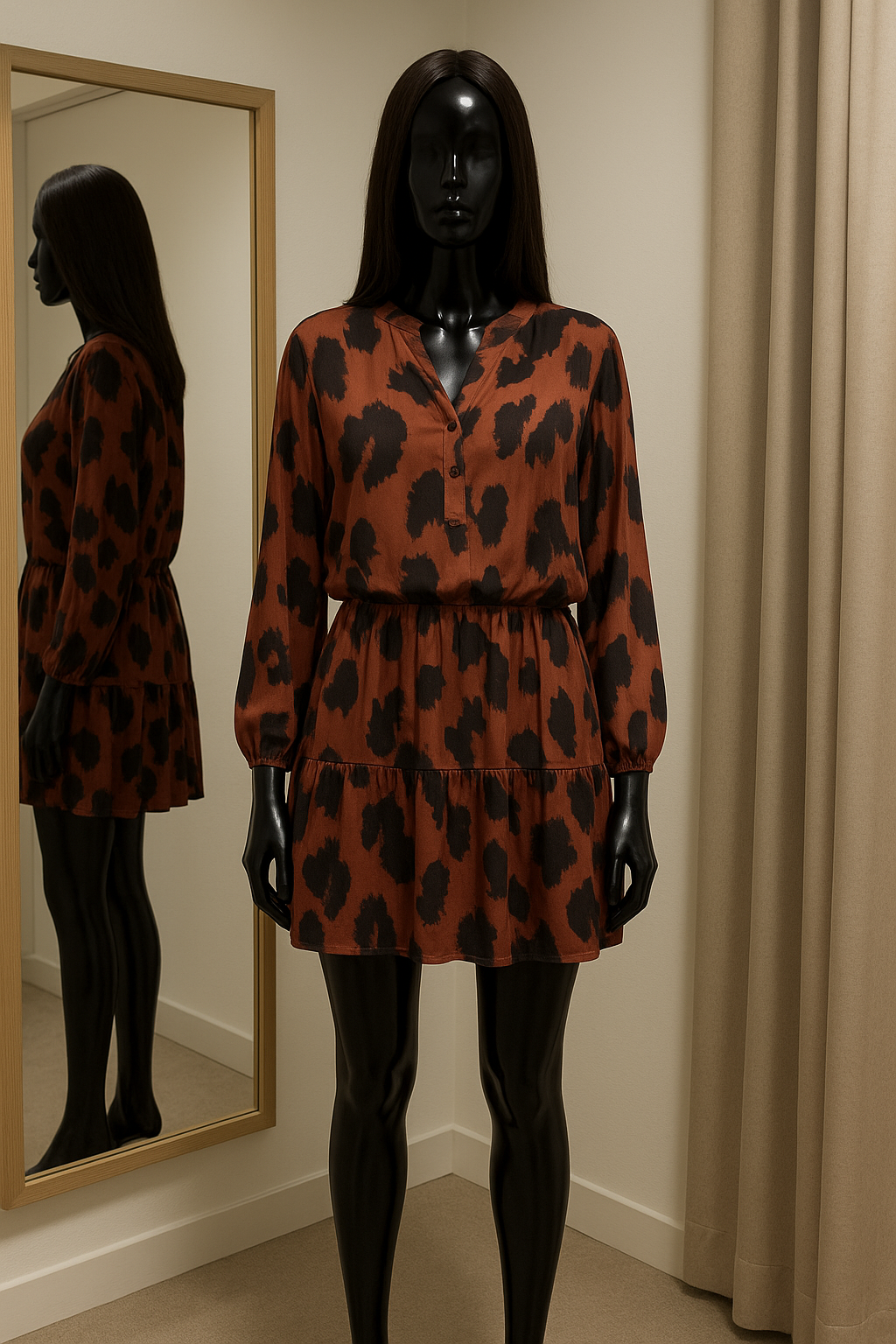 un mannequin noir brillant en plastique, sans traits du visage en Robe grain de malice taille 40 debout, face à la caméra, avec une silhouette fine, dans une cabine d’essayage de style boutique avec un miroir et une décoration neutre.