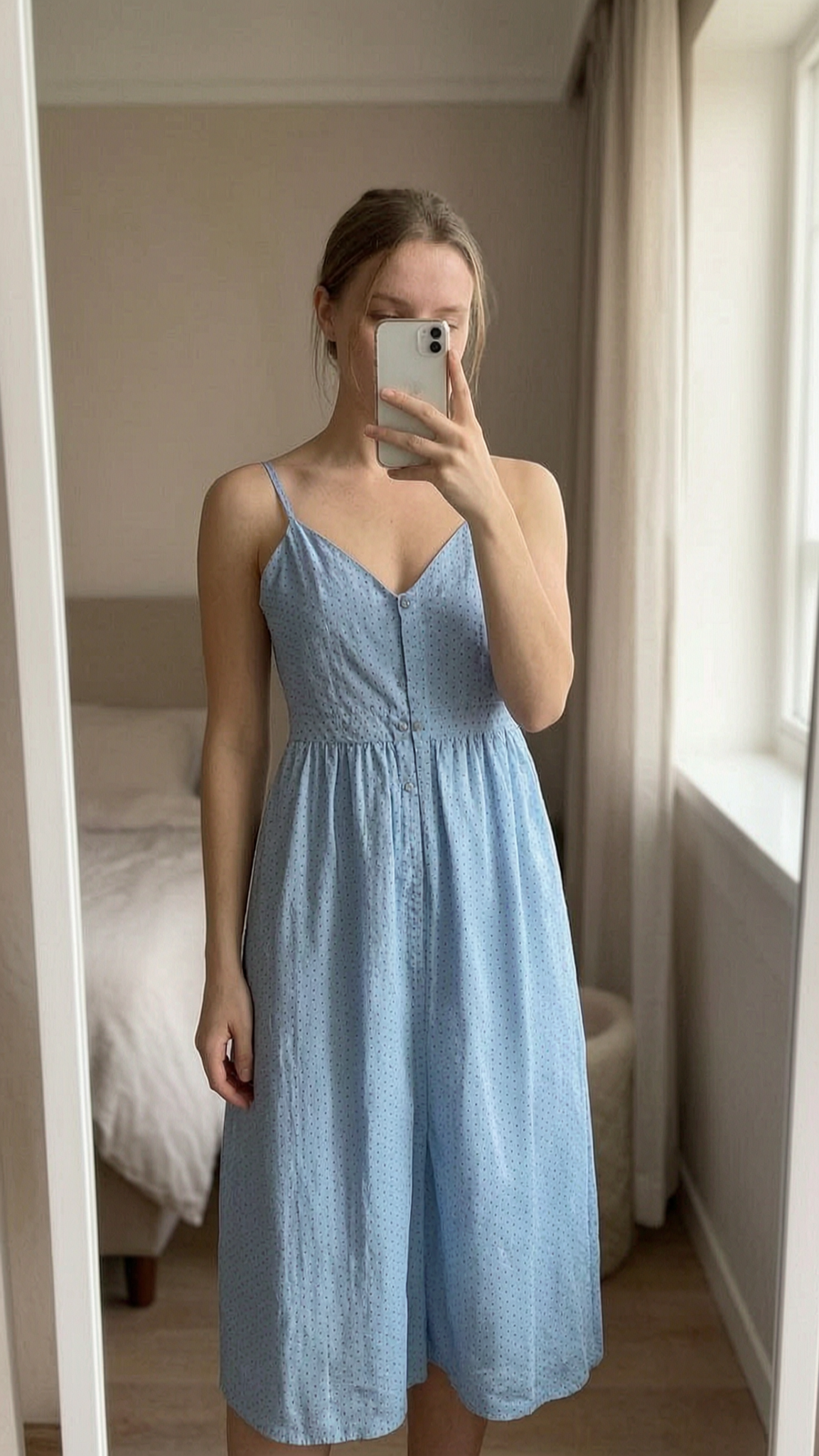 Robe H&M M à pois dos nu debout, face à la caméra, dans une chambre à la lumière douce, avec une lumière naturelle filtrant par la fenêtre.
