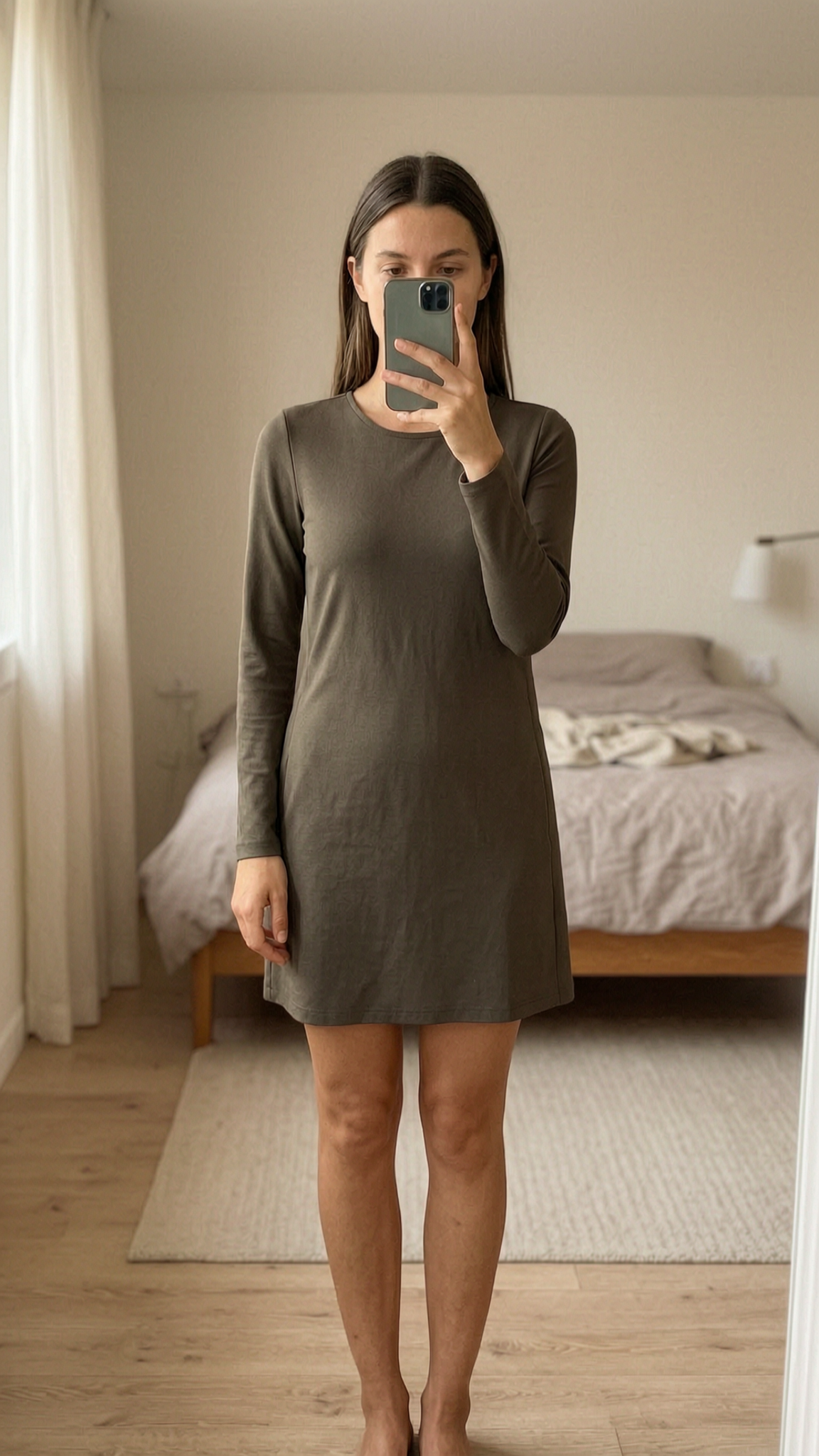 Une personne en Robe kakai h&m 36 debout, face à la caméra, avec une silhouette fine, dans une chambre à la lumière douce, avec une lumière naturelle filtrant par la fenêtre.