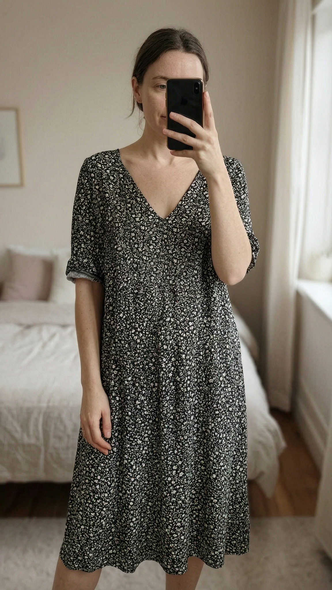 Robe kiabi debout, face à la caméra, dans une chambre à la lumière douce, avec une lumière naturelle filtrant par la fenêtre.
