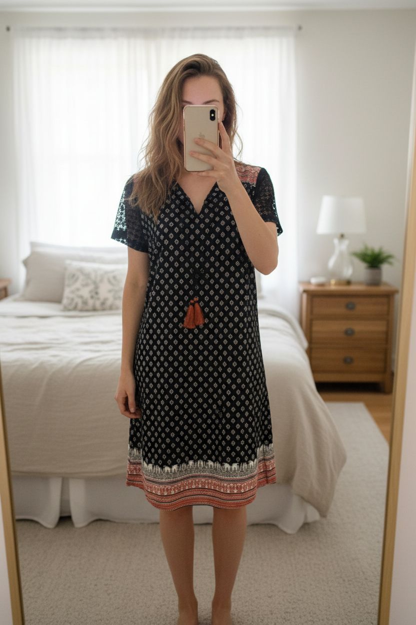 Robe légère debout, face à la caméra, dans une chambre à la lumière douce, avec une lumière naturelle filtrant par la fenêtre.