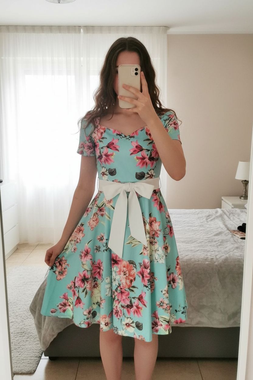 Robe Lolita chic printanière bleue et fleurs L debout, face à la caméra, dans une chambre à la lumière douce, avec une lumière naturelle filtrant par la fenêtre.