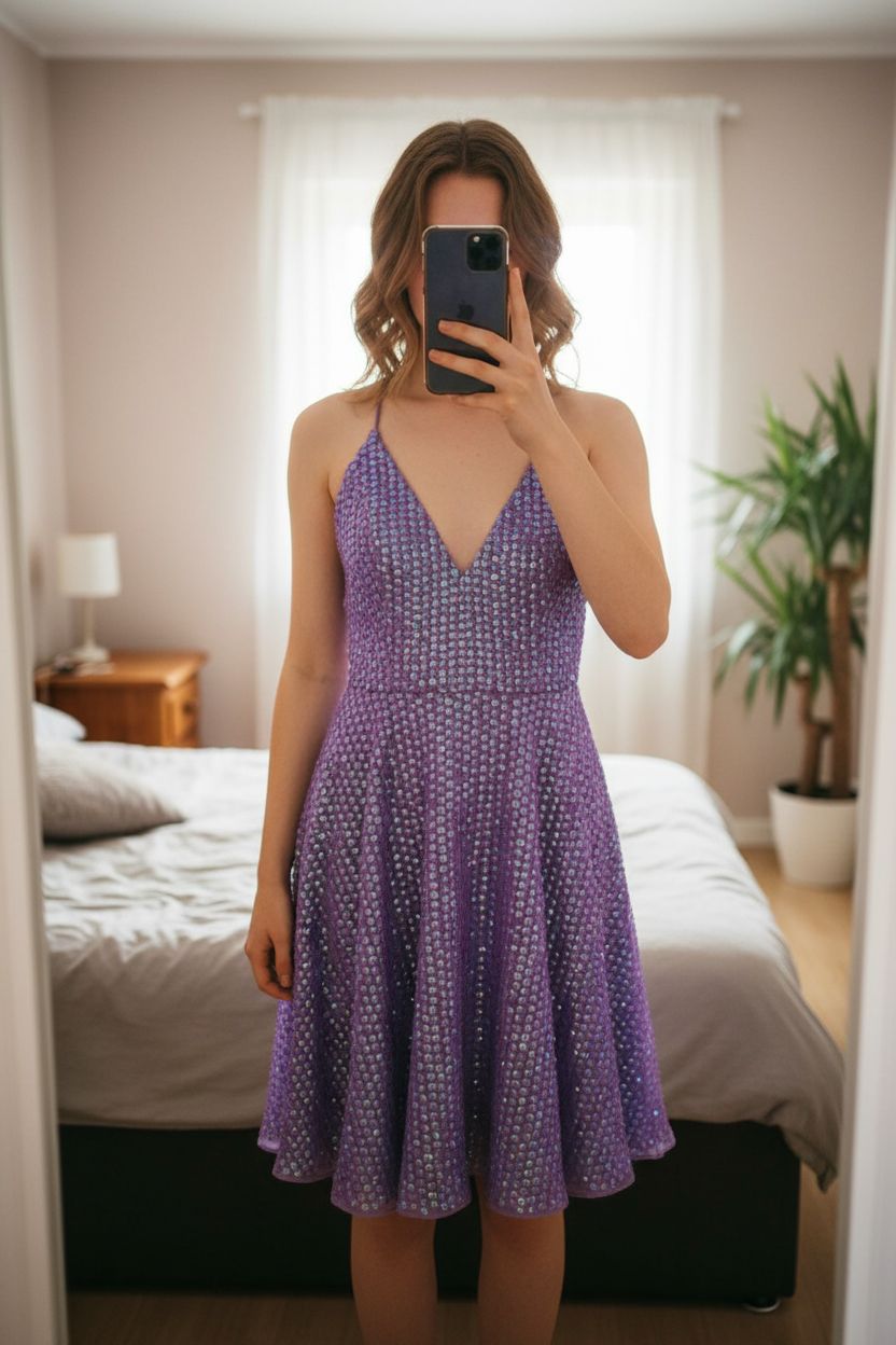 Robe Lolita dos nu avec lacets, sequins irises t40 debout, face à la caméra, dans une chambre à la lumière douce, avec une lumière naturelle filtrant par la fenêtre.