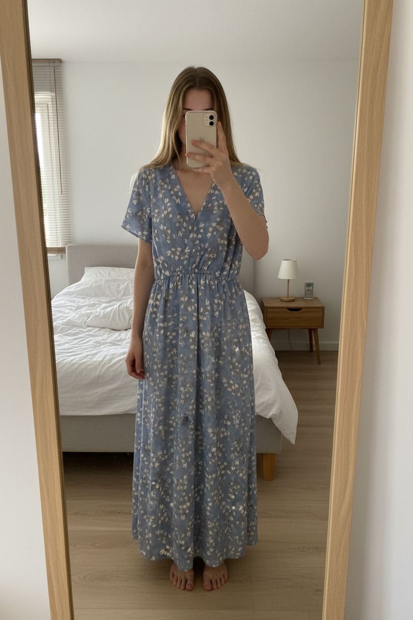 Robe longue bleue motif floral taille 38/40 debout, face à la caméra, dans une chambre à la lumière douce, avec une lumière naturelle filtrant par la fenêtre.