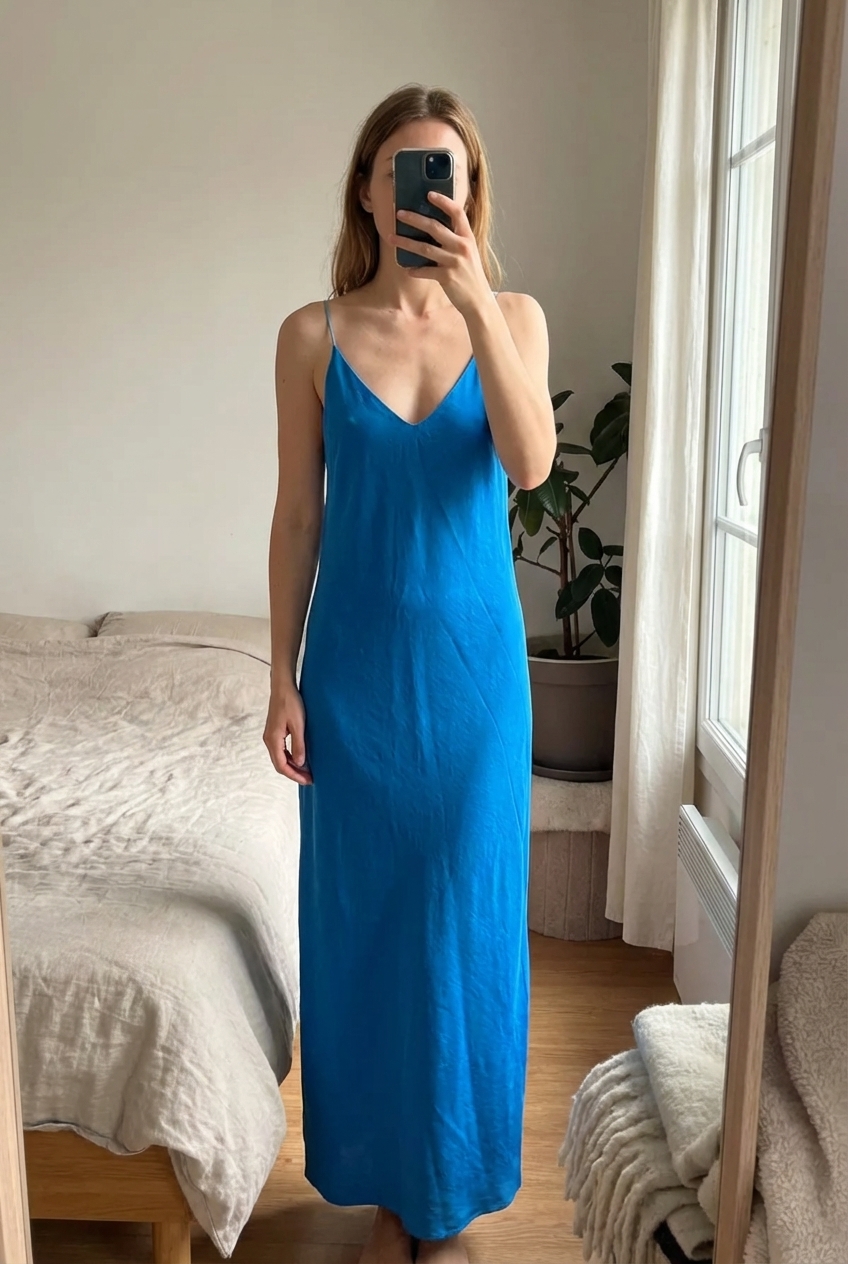 Robe longue à bretelles bleu debout, face à la caméra, dans une chambre à la lumière douce, avec une lumière naturelle filtrant par la fenêtre.